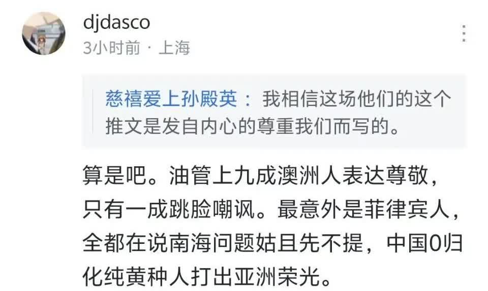 中国惜败澳大利亚,韩国和菲律宾网友反应很反差! 中国一分惜败,非常遗憾丢冠。各国网友表现不一,大部分澳大利亚网友对中国队祭出“杀气腾腾”的青春风暴表达了尊敬。赛后澳大利亚全队都侥幸逃过一劫,怎么可能不服。 菲律宾人罕见夸奖中国男篮用纯黄种人打出了亚洲荣光。韩国人非常惊讶中国队能将澳大利亚打到最后一秒,认可中国男篮重新回到亚洲一流! 很久没有看到这样的中国男篮,更罕见的是,站着拼命即使输了,外国人都送上尊敬!