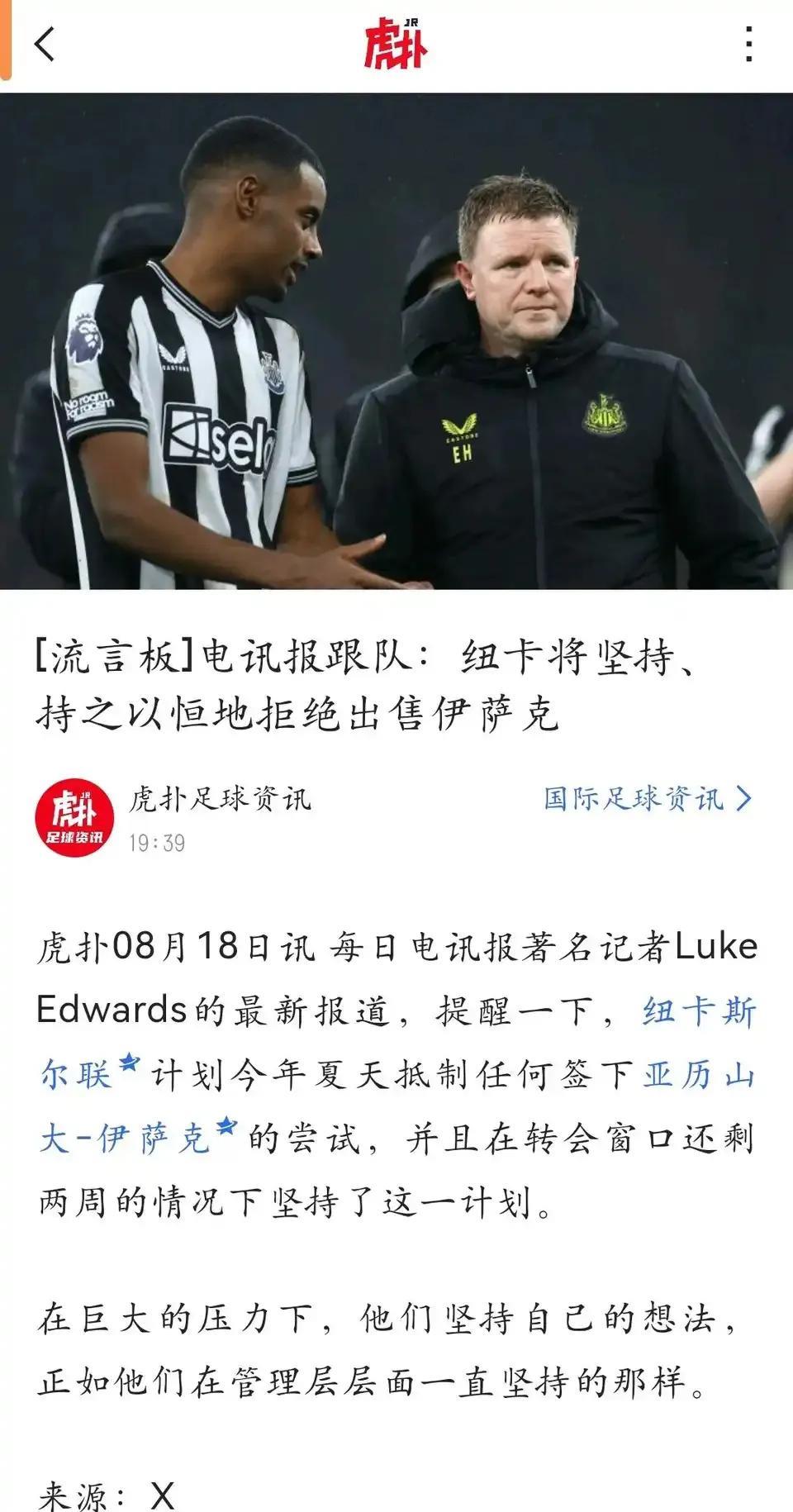 纽卡斯尔将坚持,持之以恒的拒绝出售伊萨克??? 那完蛋了,伊萨克也不上场,一个1