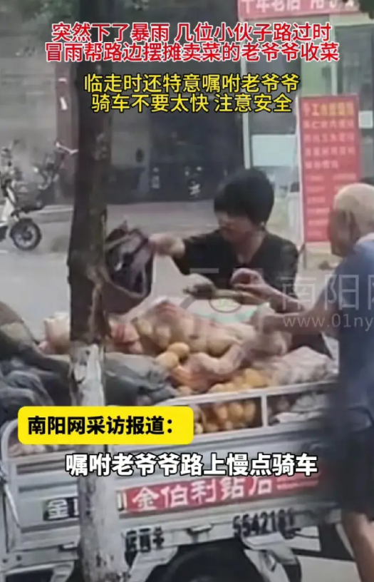 河南,老人正在路边卖菜,忽然下起大雨,老人赶紧收拾蔬菜往三轮车上放。忽然,从雨中跑过来3个少年,直奔老人去。有一个染黄头发的,特别醒目,老人吃了一惊,心想:这可怎么办,遇上抢菜的混混了。