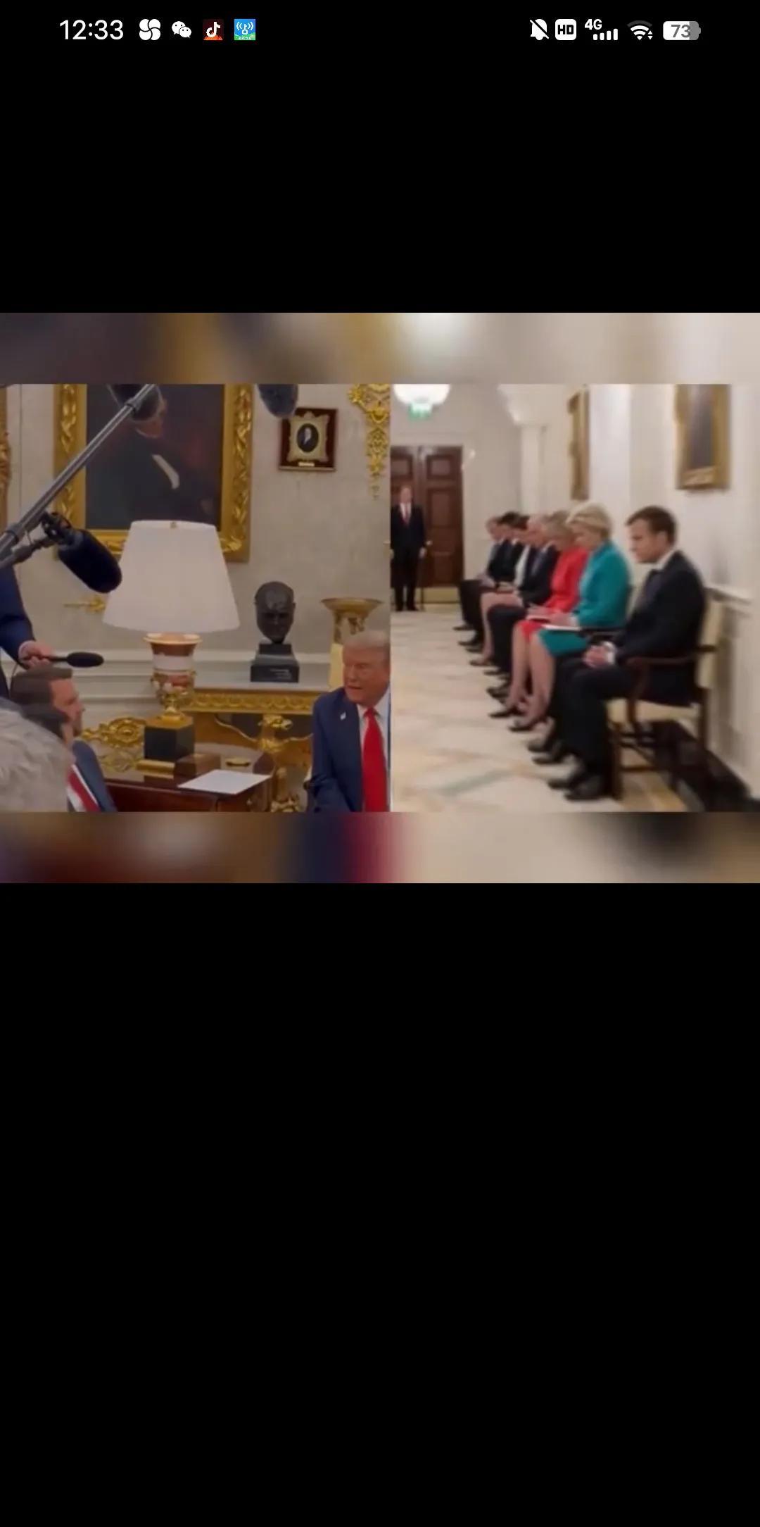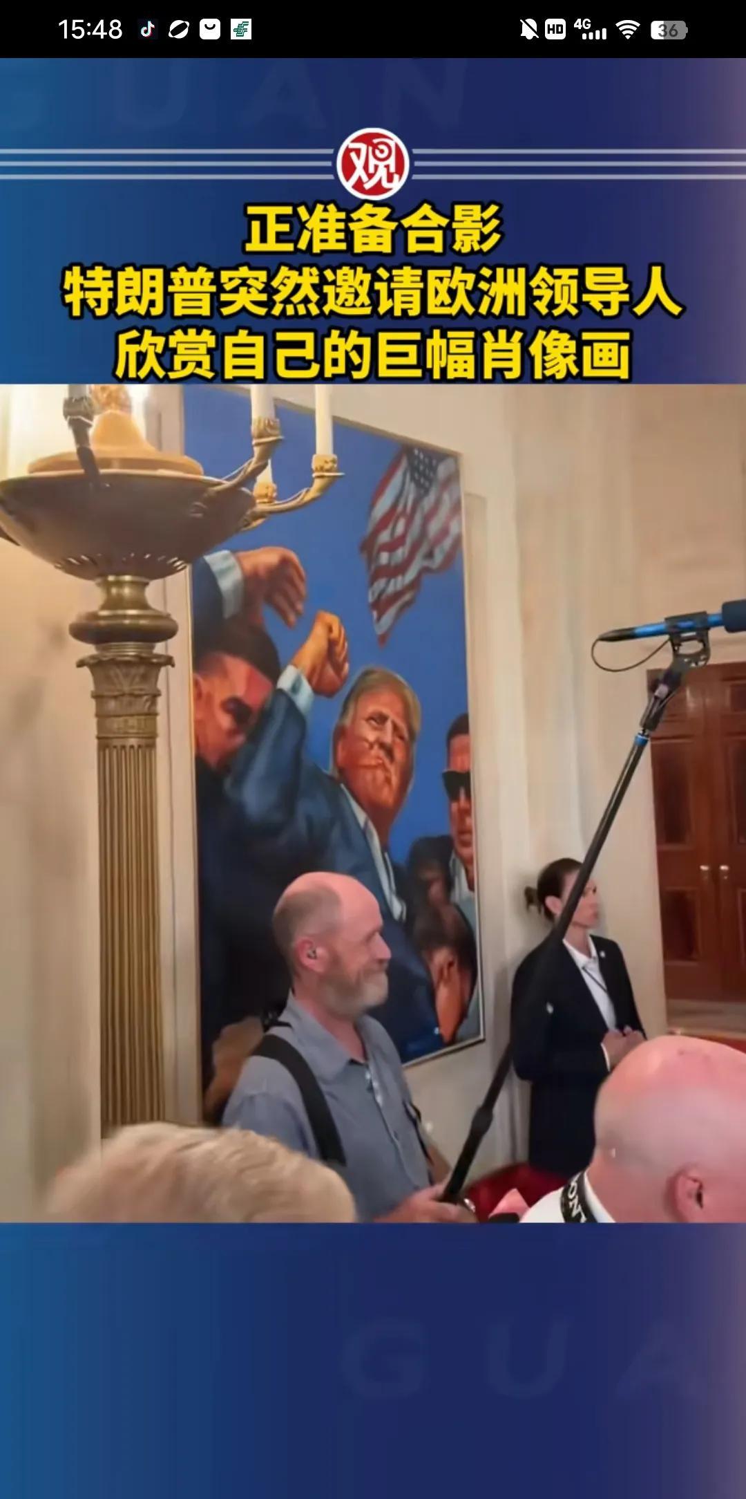 欧洲领导人正在拍照,突然特朗普向大家示意,请看自己的英俊的肖像画。欧洲这帮人组团去美国给特朗普施压,泽连斯基在内接受询问他们在门口坐在凳子等待,好像等待班主任问话的小学生,美欧关系就这样,你们是小弟。