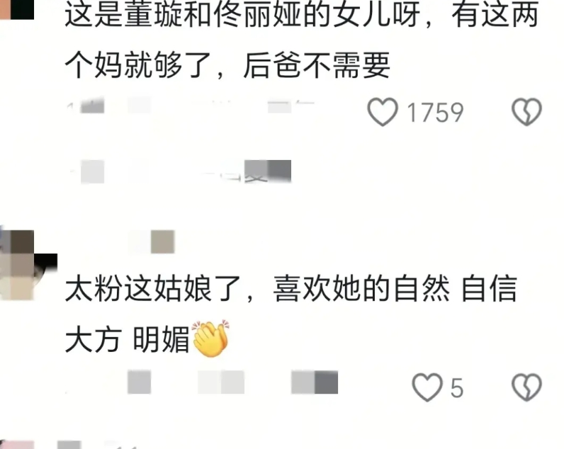 有网友就喊话董璇,别急着谈恋爱了先,赶紧出一下,培养活泼开朗女孩子的教程!还有网友说,这是董璇和佟丽娅的女儿,有俩妈就够了!