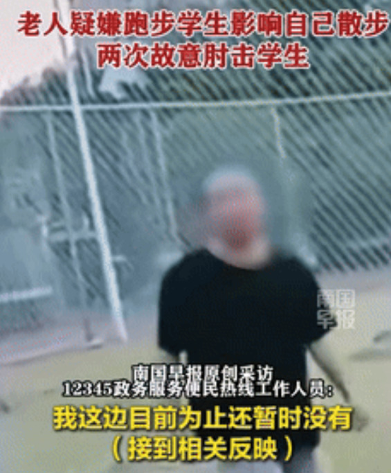 从视频里能清楚看到,学生们发现老人后都主动放慢脚步,往跑道中间靠拢,可就在一个学生经过时,大爷突然转身,用手肘狠狠顶向学生胸口。