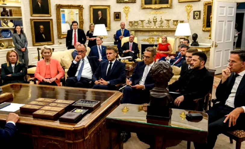 屋里一张办公桌、八张凳子,特朗普自己坐在桌子后头的大皮椅上。桌子前面那八张木凳子,坐着好些欧洲领导人和他的手下,卡罗琳也在这儿(站着的跟后排坐的就不算了)。