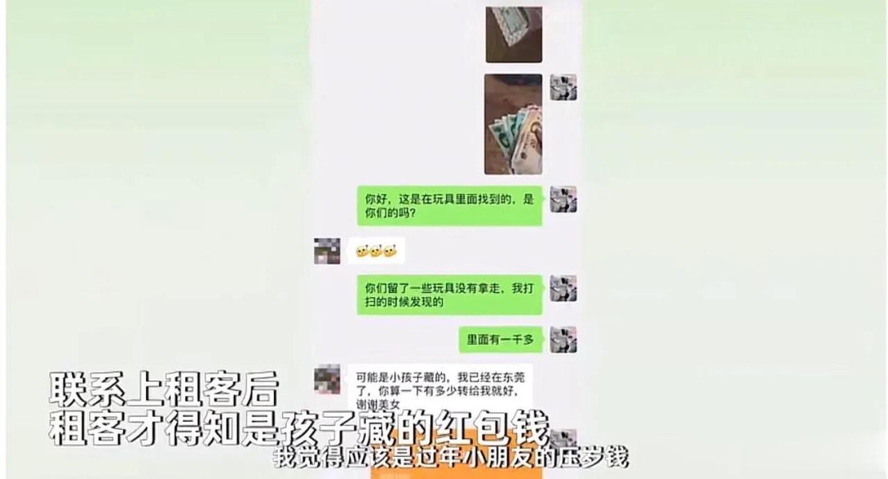 在和租客确认过这些东西都不要之后,叶女士觉得玩具还挺新丢了怪可惜,刚好自家楼下就是一家幼儿园,如果把玩具给小朋友们玩也算是物尽其用了,孩子们肯定也很开心。 在把玩具送给幼儿园之前,叶女士决定把玩具先清理一下擦洗干净,这样更有利于孩子们的健康。 而就在叶女士清理一个玩具手提包时,却意外发现里面有一叠现金,她拿出来一看,里面全是面值20和50元的纸币,钱还是崭新的,总共1400元。 看样子这应该是前租客家女儿的压岁钱,小朋友也学着大人的样子,把钱装进了自己的手提包。 发现钱后,叶女士没有犹豫,很快联系上了前租客,一番询问后证实她的猜想是正确的,孩子把压岁钱放进玩具里,大人却不知情。随后叶女士以线上转账的方式,将1400元转给了前租客。