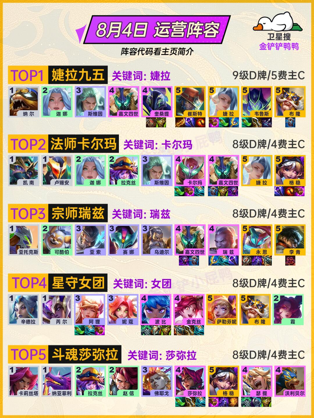 姐妹们,明天金铲铲之战开服啦! 鸭鸭推荐10套T0阵容,有5套是低费阵容,有5套是高费运营阵容! 既适合新手,又适合进阶的朋友~ 祝你们明天定位赛5连🐔哦~ 金铲铲之战 云顶之弈 金铲铲之战S15