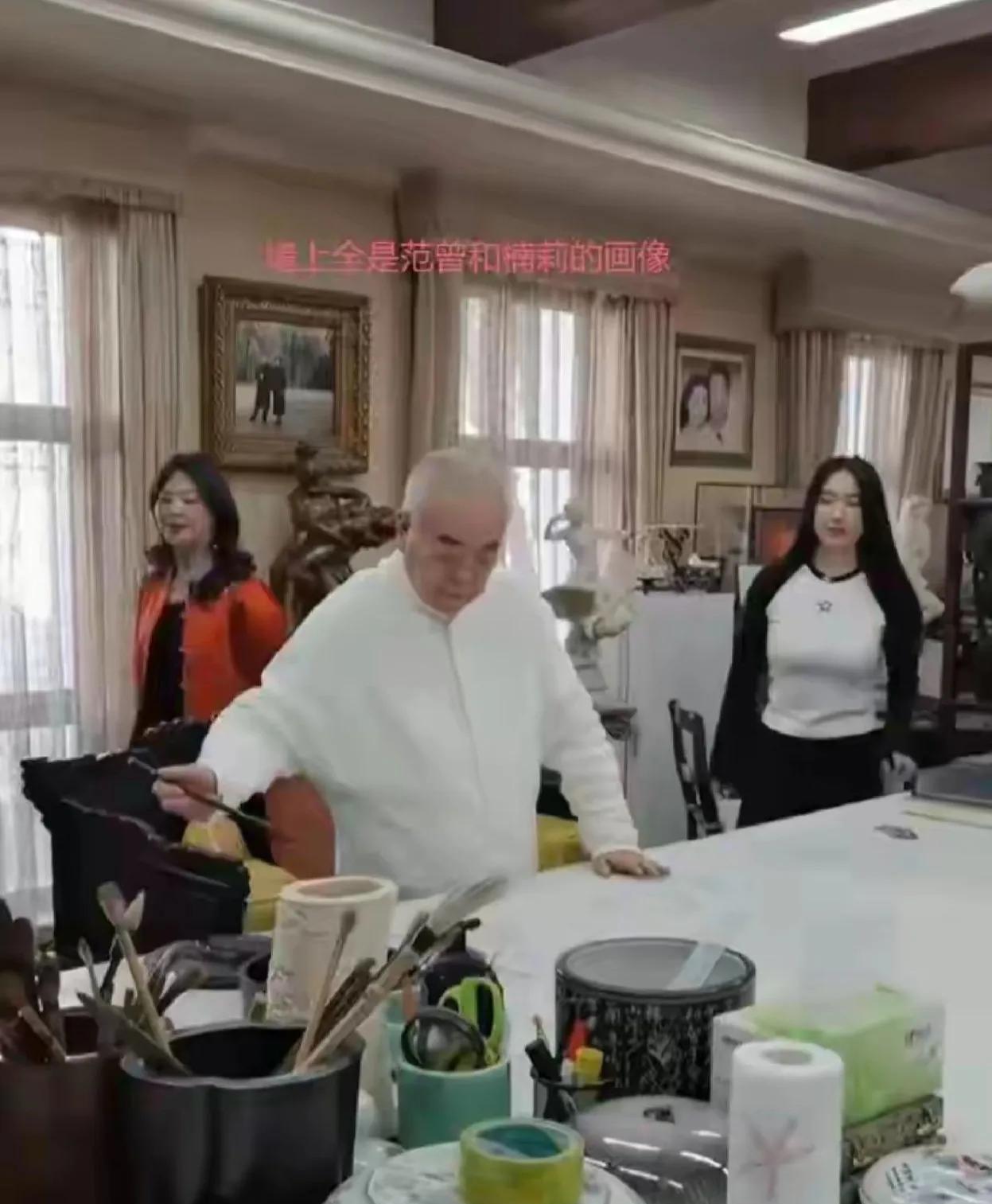 原来这幅图的原景是这样的!楠莉的二儿子范仲达也在。 范曾身旁围着继子、亲女、新妻三人。 大师执笔凝神,挥毫泼墨,专心创作,那三人将他围在中间,不知是在看字还是在看人。 范曾之外,这三人之间都没有血缘关系。 范晓蕙只和范曾有血缘关系,可跟这屋里其他人和物都没有关系。 范仲达跟这屋的东西有关系,因为他母亲在这里生活了二十多年,墙上也都是母亲楠莉与继父这些年的合影。 徐萌属于新入住人员,只和人有关系。 其实论与碧水庄园感情深的,也只有范曾一人 现在,老先生已经和第四任妻子移居别处,女儿范晓蕙对此完全不知情,另外三人知道也不告诉她。 以后范老先生案前笔走狂龙之时,恐再难出现子女妻一同观看的场景了。