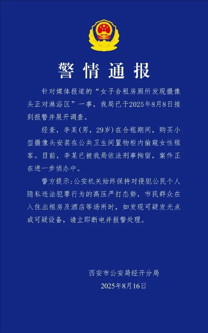“必须严惩!”西安,小伙去姐姐出租房洗澡,不料,竟然在卫生间抽屉里,发现了一个摄像头,而且正对着淋浴区,这个摄像头可以不联网,不插内存卡,小伙告诉姐姐后,姐姐怀疑不是房东就是室友干的,果断选择了报警!警方:嫌疑人已被抓获! 据法治进行时8月16日报道,马女士的表弟小刘只是想去冲个凉,合租房的卫生间不算大,但干净整洁。 他拉开洗手台下的抽屉想找找有没有新的沐浴露,却无意中发现抽屉内侧的背板不太对劲——木板接缝处有个不显眼的小孔,周围还有新鲜的刮痕。 好奇心驱使下,他用钥匙轻轻撬开了那块松动的木板。下一秒,他整个人僵住了:一个黑色微型摄像头,镜头正直直对准淋浴花洒的方向。 设备没有连接任何线路,也没有插内存卡,是一种能本地存储、即插即用的隐蔽型号。小刘瞬间头皮发麻,抓起浴巾冲出卫生间,声音发颤地喊来了姐姐。 马女士看到设备后浑身发抖,她想起自己近一个月来几乎每天都会在这个淋浴区洗澡,而那个被精心藏在夹层、用杂物巧妙遮掩的摄像头,无声地吞噬着她的隐私。 她立刻意识到,能接触到这个空间的人极其有限——不是房东,就是合租的室友。没有任何犹豫,她按下报警电话。 警方到来后勘查发现,摄像头安装位置刁钻,镜头角度经过反复调试,确保能清晰拍摄到整个淋浴区域,且设备表面被擦拭得干干净净,没有留下指纹。 这一切都表明,安装者不仅早有预谋,还具备相当的反侦查意识。一位女性租客吓得当晚就去住了酒店,男租客李某则始终没有回应。 警方调取公共区域监控发现,李某曾在案发前多次单独进出卫生间,每次停留时间异常。进一步搜查其房间后,办案人员在他的笔记本电脑里发现了大量偷拍视频片段。铁证如山,李某当场瘫软在地。 更让人心寒的是房屋中介的事后态度,马女士联系签约公司,对方先是推诿合同上的法人“早就联系不上”,后又表示具体对接的业务员“已离职”。 经多次交涉,中介仅同意退还50%的租金,拒绝赔偿精神损失,也否认需为安全隐患承担任何责任。这种冷漠回应让马女士深感维权无门。 事件经媒体报道后,许多网友分享类似经历:“租房一定要用检测仪扫一遍!”“有些摄像头不联网、不发信号,根本防不胜防。” 也有人愤怒指责:“偷拍者必须重判!中介也不能放过!”更有人无奈感叹:“独居女性到底要怎么保护自己?” 西安经开公安于8月16日通报:29岁的李某因涉嫌侵犯公民个人信息罪被刑事拘留。警方提示市民,入住出租房或酒店时,应留意异常发光体或可疑设备,发现情况立即断电并报警。 这起案件虽告一段落,却揭开合租时代隐私安全的脆弱面。从偷拍设备的轻易可得,到安装者的处心积虑,再到中介机构的敷衍推责,每一个环节都折射出维权机制仍存在大量空白。 法律的制裁固然重要,但若缺乏有效的监管、严厉的惩处和企业的责任心,这样的“隐形眼睛”或许仍会在黑暗中闪烁。安全感不应成为一种奢侈,它值得被社会郑重守护。 信息来源于:法治进行时 2025年8月16日 《女子在合租房内发现摄像头在卫生间抽屉正对着淋浴间 “这个摄像头可以不联网 不插内存卡”警方:已经立案 正在调查》