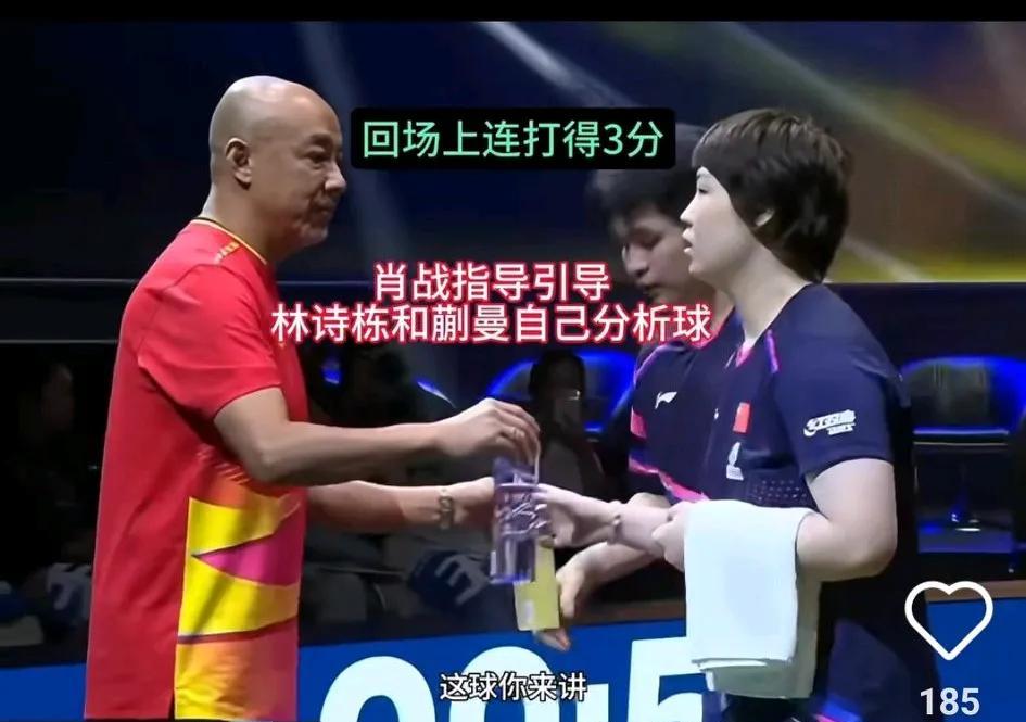 肖导提问:这球你俩来讲发什么? 确实以前带莎头比较省心,局间都是他俩沟通的多。昨晚的混双比赛中,肖导现场提问林诗栋、蒯曼,引导他俩分析下个球该怎么打,虽然栋曼组合也配了很久,在场上还是沟通的少。 这次瑞典大满贯,国乒混双就只报了这一对,肖导压力也大啊。在混双1/8决赛中,林诗栋/蒯曼3-2弗朗西斯卡/考夫蔓,比分:8-11,11-2,11-7,8-11,11-8。确实是险胜,今天的混双1/4决赛林诗栋/蒯曼对林昀儒/郑怡静,有网友说:“不敢想象下一轮怎么打,这都赢得这么困难,你两平时讲话吗?”上次瑞典大满贯俩人开始沟通了,这次咋又有点不熟了呢。 考夫曼这对混双感觉还会再配的,打的挺不错的,考夫曼的单板质量也高,打出来的球有力量,昨晚弗朗西斯卡失误多一些,要不然谁输谁赢真的很难说。现在外协双打是各种配,国乒也可以尝试一下新的组合。