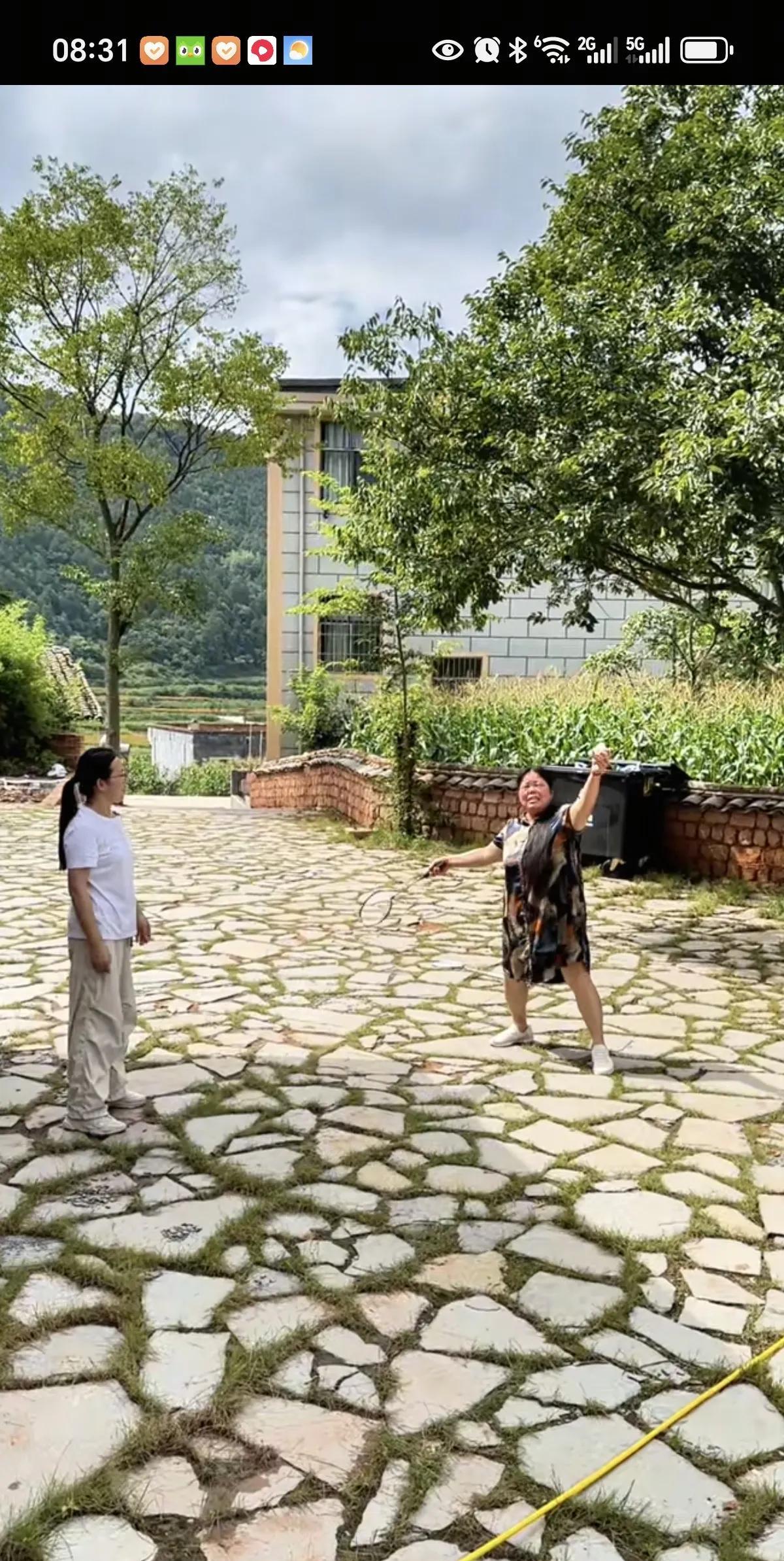 小凤婆婆今天终于被小凤喊动了[偷笑],不容易。 小凤要打羽毛球,喊上小娜老爹还有
