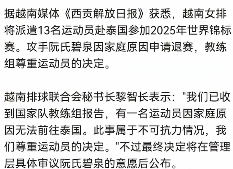 越南人终于怕了! 为了避免U21女排世锦赛被取消成绩的覆辙,越南排联终于变聪明了,他们将越南女排队内头号得分手阮氏碧泉从名单中撤了下来。 越南知名媒体《西贡解放日报》发布消息说,越南女排只派了13名运动员赴泰国参加2025年世界锦标赛,队内头号得分手阮氏碧泉并未随队奔赴泰国,美其名曰是因为“家庭原因”申请退赛,其实说成是因个人原因更为准确。 越南排球联合会秘书长黎智长表示:"我们已收到国家队教练组报告,有一名运动员因家庭原因无法前往泰国。此事属于不可抗力情况,我们尊重运动员的决定。"这并非不可抗拒的力量,而是纯粹在于人为。 越南女排这是不打自招,因为他们非常清楚阮氏碧泉的性别是否存在问题,如果阮氏璧泉继续参加世锦赛,很有可能会像U21女排那样被举报,然后被勒令参加性别检测,这样他们不仅不能取得好成绩,而且会在国际排坛上名誉扫地,甚至是损害国家形象,这是越南政府绝对不能允许的。 雄兔脚扑朔,雌兔眼迷离,双兔傍地走,安能辨我是雌性。双臂粗壮,双脚扑朔,岂能辨不出你是男儿身?