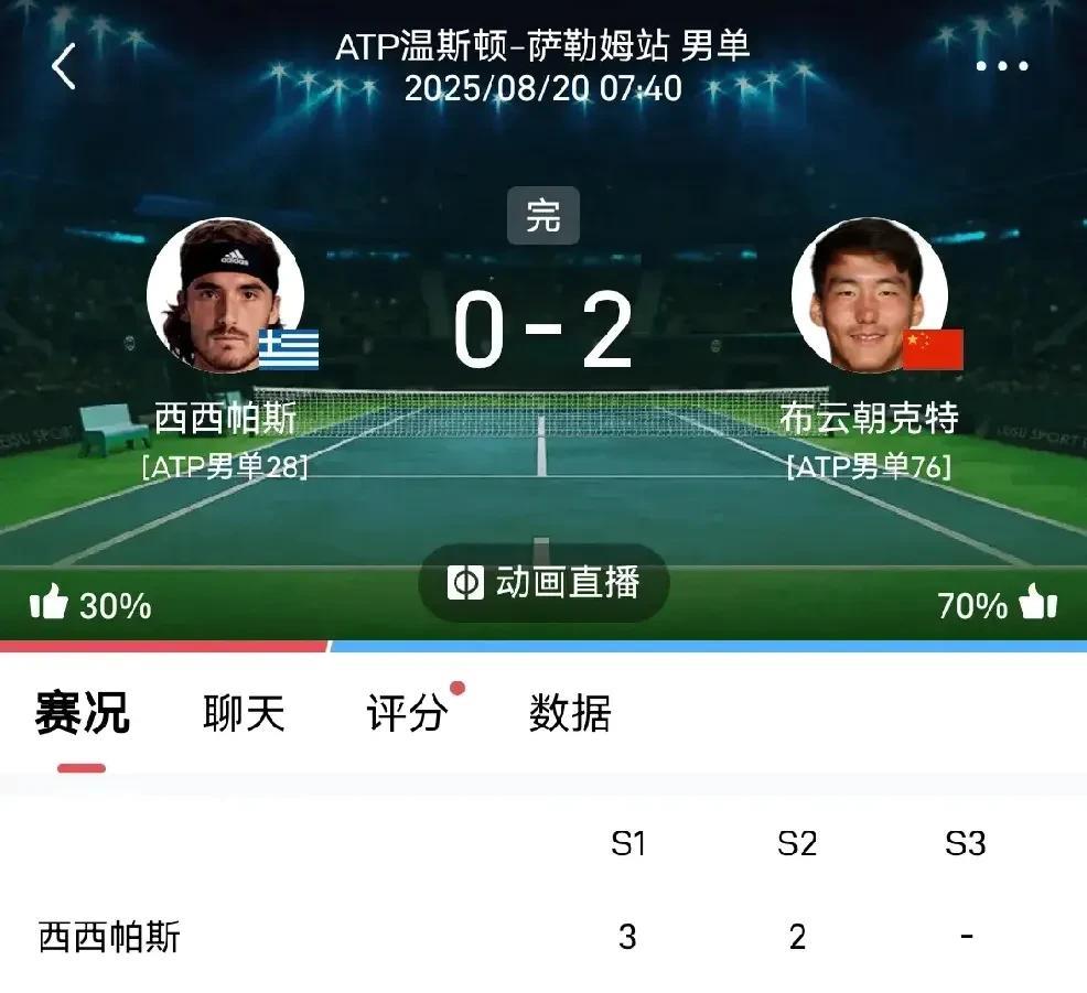 ATP250温斯顿塞勒姆巡回赛男单第二轮,布云朝克特以6-3、6-2横扫世界排名第28位的头号种子西西帕斯,强势晋级8强,小布就此终结了对世界前30的九连败,继去年中网后,再胜世界前30,这也是他继蒙彼利埃站后首次取得巡回赛正赛的连胜,为即将出战的美网积累了信心。