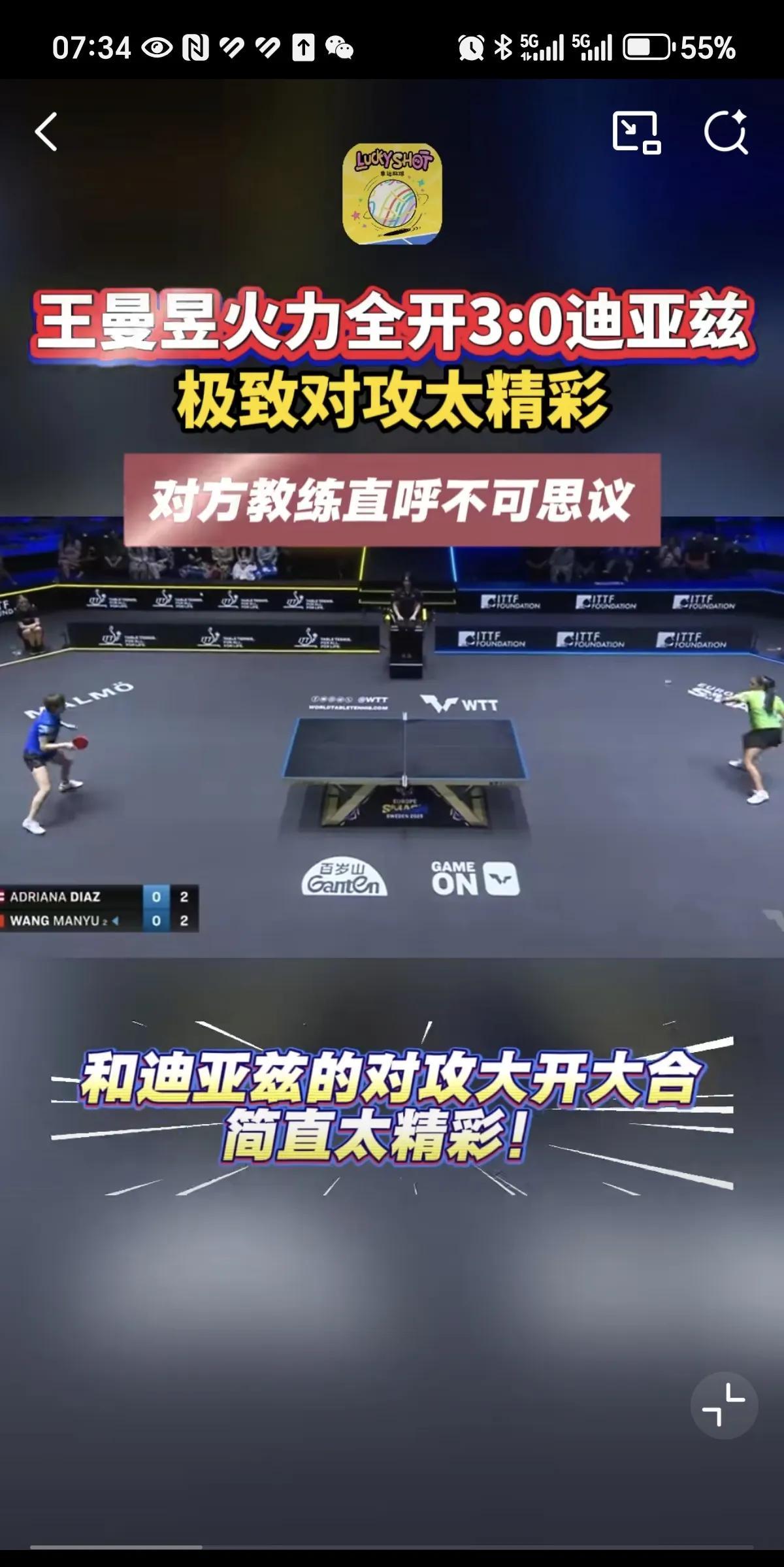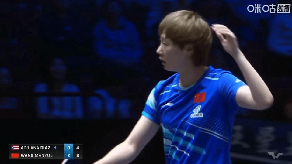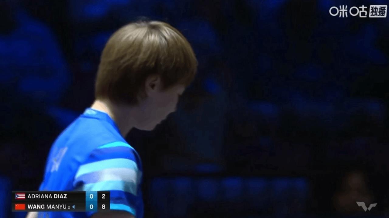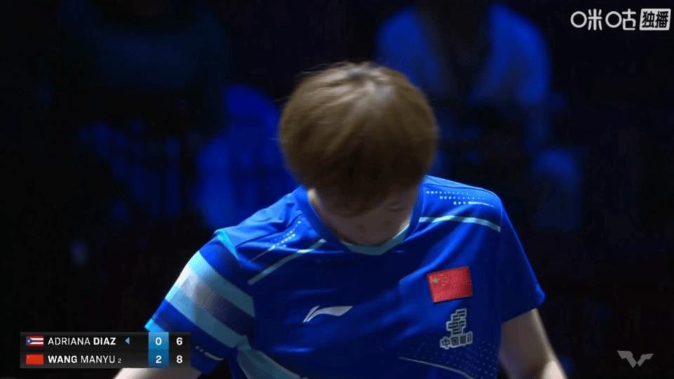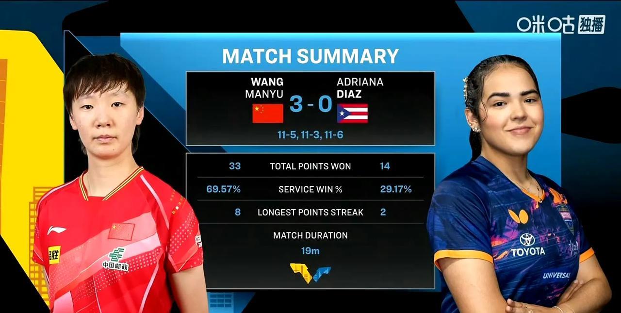 08月20日,王曼昱耗时18分,快速下班,晋级16强,感觉马琳上班越来越轻松了,王皓隔着屏幕都羡慕马琳有一群听话又乖巧的孩子 王曼昱3:0轻松战胜迪亚兹,整场比赛,王曼昱打得游刃自如,无论对手什么球,都能打回去,双方也打得相当精彩,有一个球,双方竞然打了27板才决出胜负,观众大呼精彩,看着王曼昱逐渐找回状态,全场压制迪亚兹,太帅了 三局比分是: 11:5,11:3,11:6