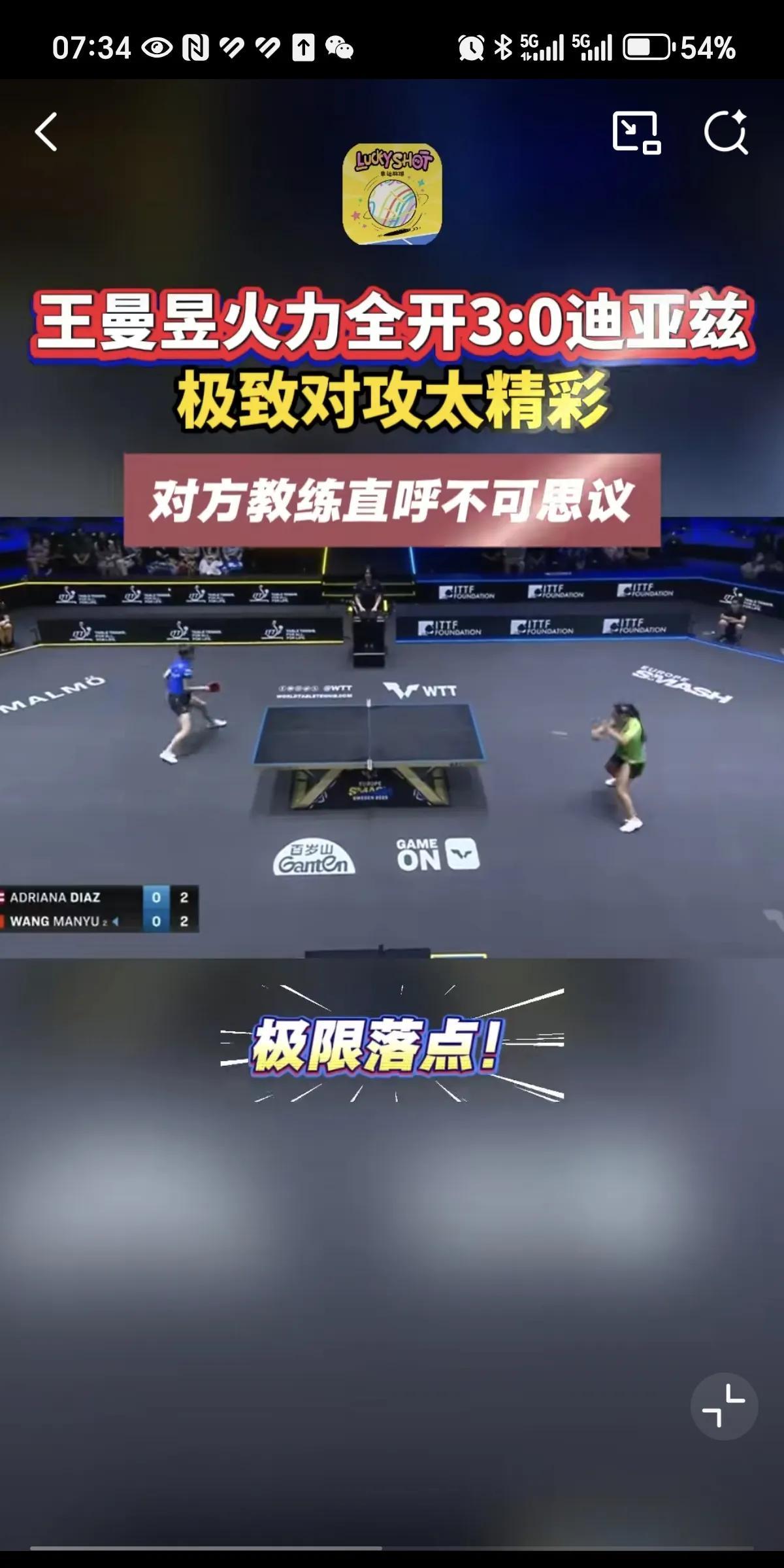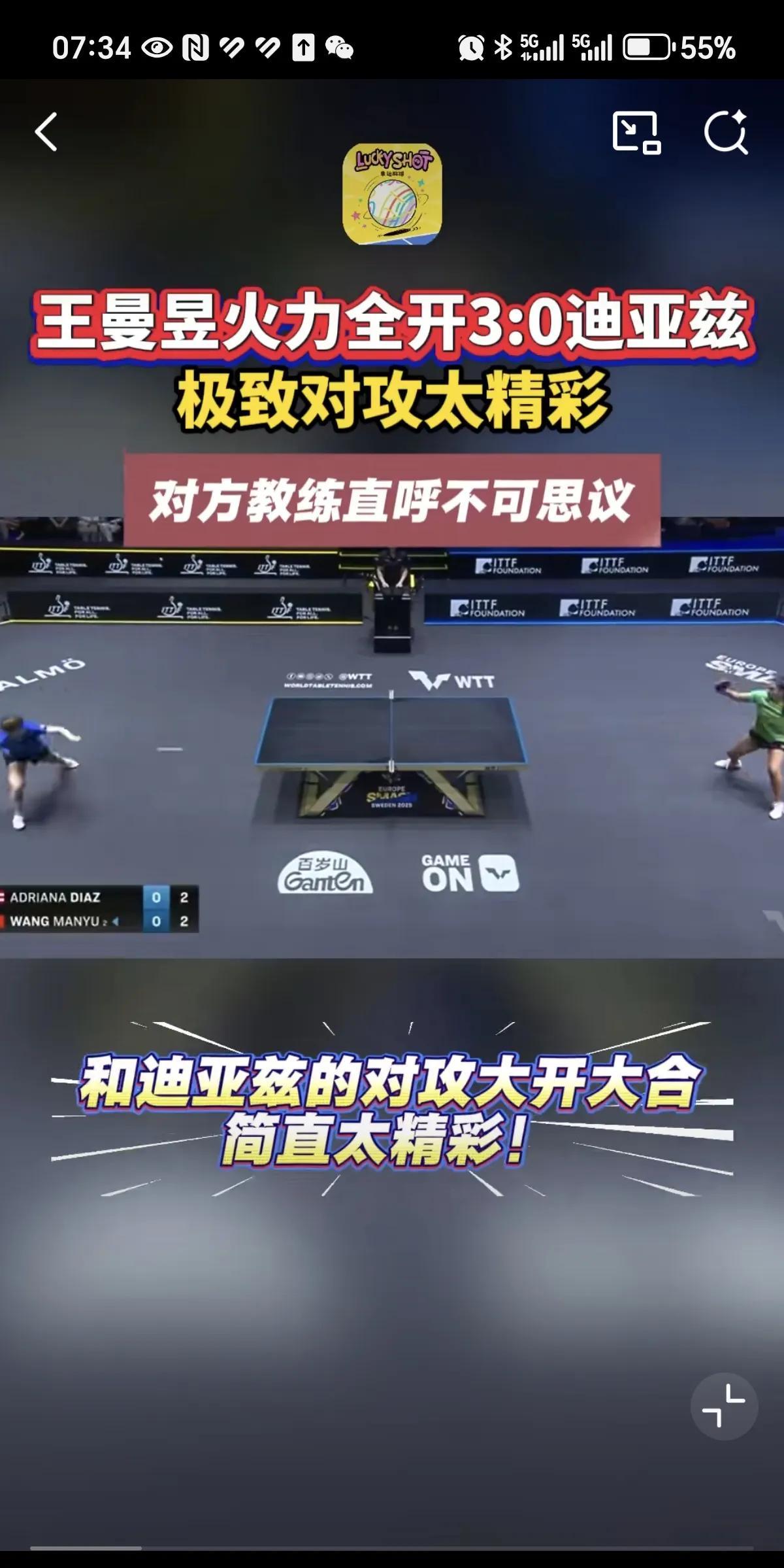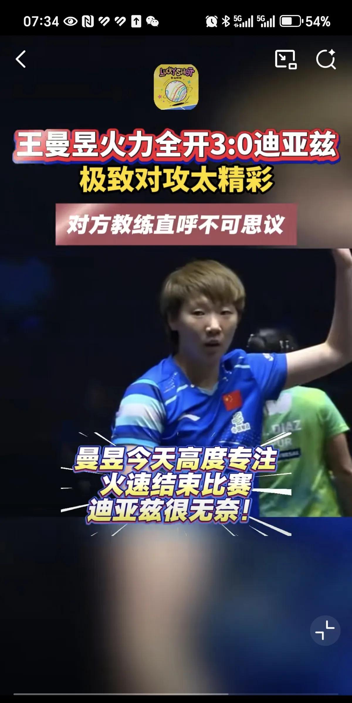 08月20日,王曼昱耗时18分,快速下班,晋级16强,感觉马琳上班越来越轻松了,王皓隔着屏幕都羡慕马琳有一群听话又乖巧的孩子 王曼昱3:0轻松战胜迪亚兹,整场比赛,王曼昱打得游刃自如,无论对手什么球,都能打回去,双方也打得相当精彩,有一个球,双方竞然打了27板才决出胜负,观众大呼精彩,看着王曼昱逐渐找回状态,全场压制迪亚兹,太帅了 三局比分是: 11:5,11:3,11:6