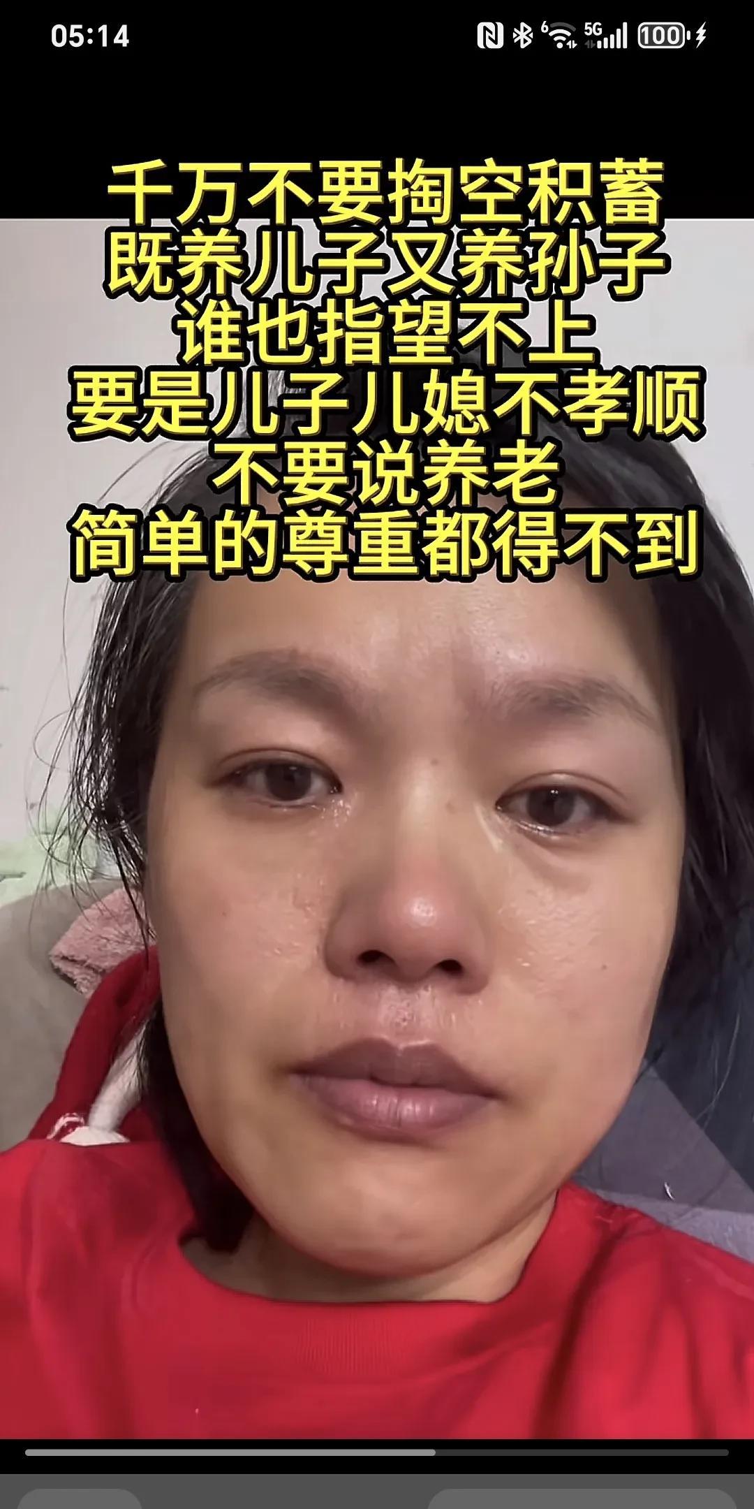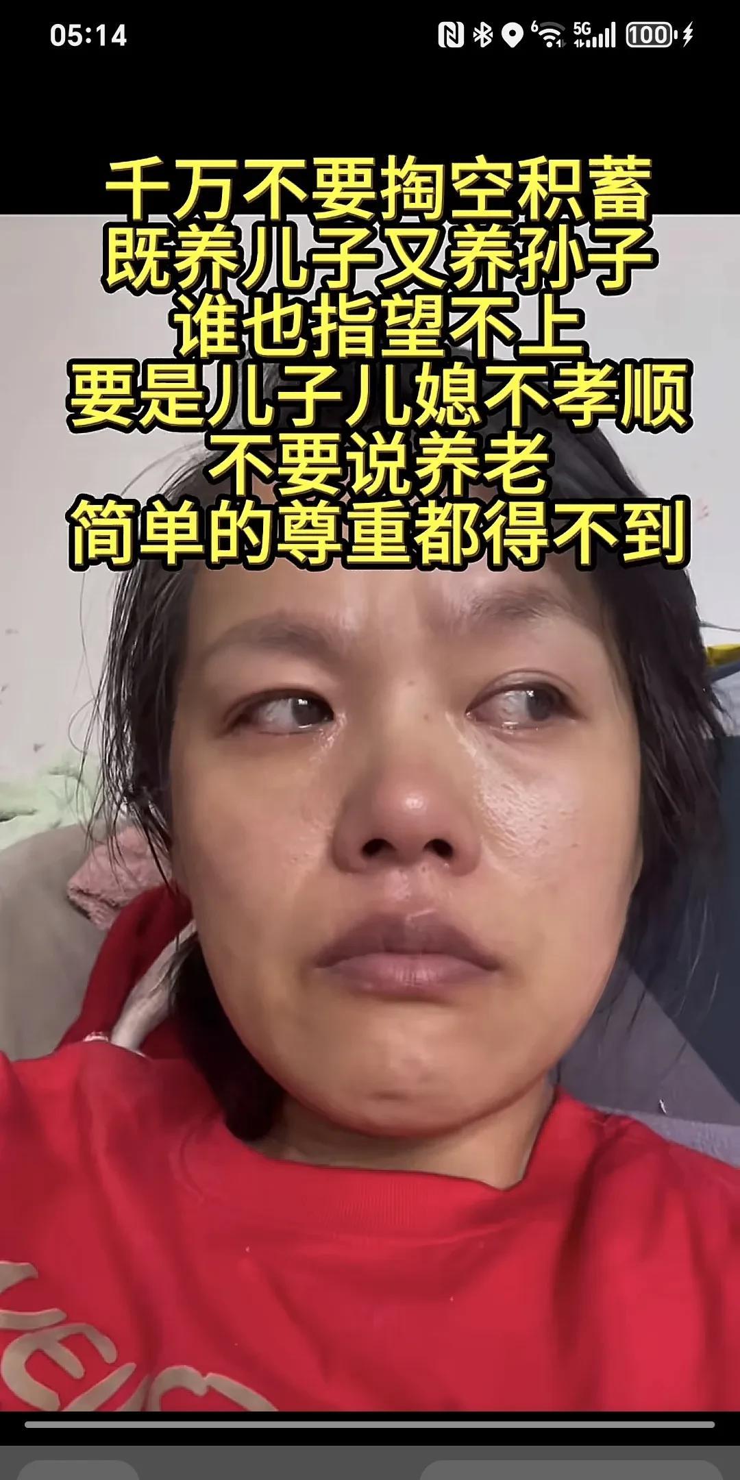 千万不要掏空积蓄既养儿子又养孙子,谁也指望不上,要是儿子儿媳不孝顺,不要说养老了,简单的尊重都得不到~ 奉劝所有讨好儿女的老人们,一定把钱袋子捂住了,要不然你会很惨,除非救儿女的命才能拿,儿女都结婚了以后一律不管。 我为了孩子把全部的钱都掏出来了,而且还跟他们借了钱贷了款,现在孩子不听话,自己没白天黑夜的干活,连自己手痛都舍不得去医院看看,我觉得每个父母的心酸只有自己清楚。