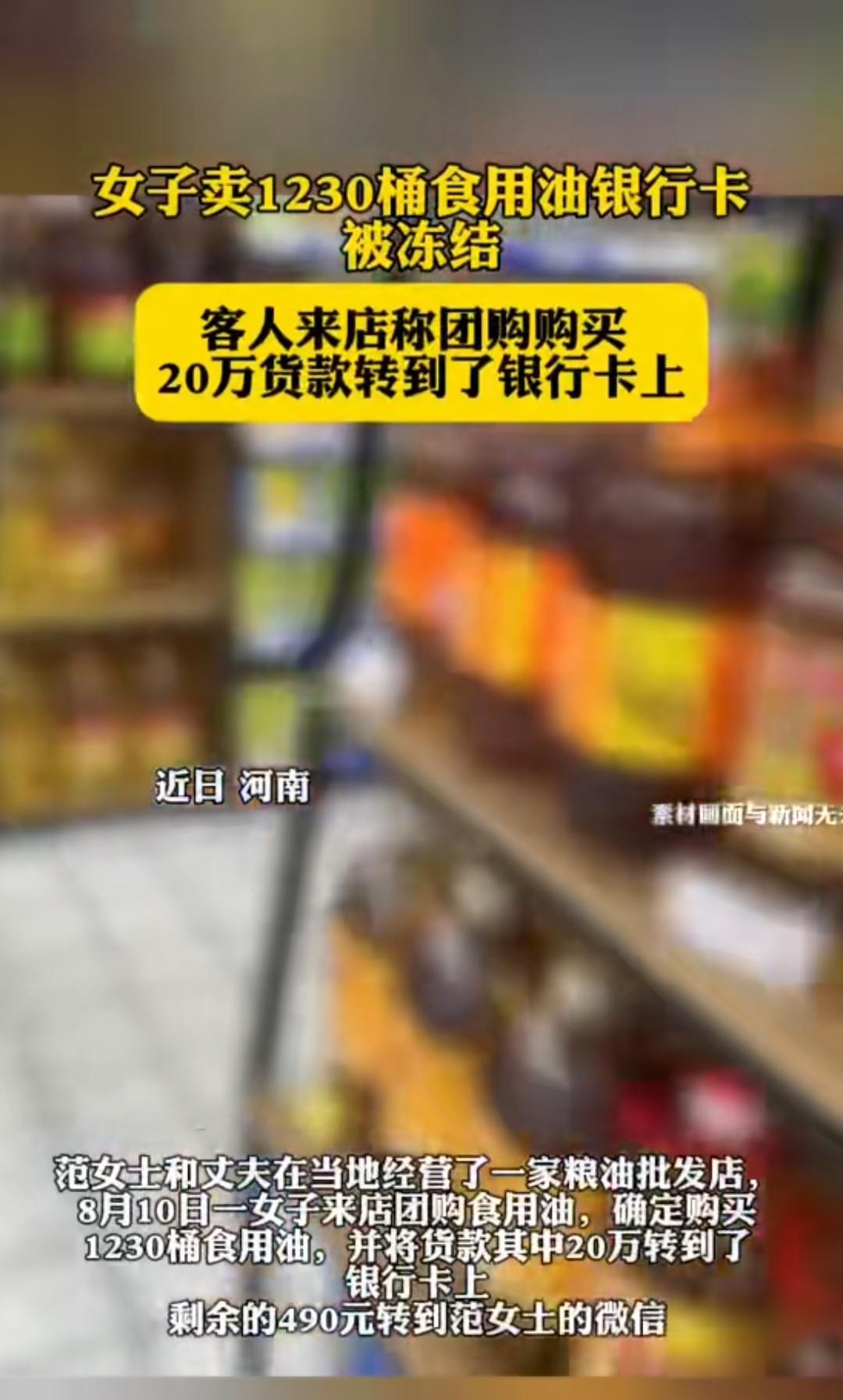 河南漯河,女子和丈夫经营的粮油店来了一个大单,一名女子要买1230桶食用油,价值20多万,女子以为做成一笔大生意,结果对方把油拉走后,女子的卡突然被封了,民警告诉女子,对方付给她的20万余元是来源不明的涉案资金。女子崩溃:现在生意根本做不了,银行卡全被封了,货卖出去,钱都收不到! 河南漯河。范女士夫妻长期经营着一家粮油店。8月10日,店里突然来了一名女子,要买1230桶食用油。 范女士见女子要买这么多桶食用油,哪怕自己是做批发的,也有些疑惑。 她就问这位女子买这么多油,到底是干什么用的? 女子和她解释道自己是做团购的,这些油到时候都会分批卖出去。 范女士之前也见到过做团购的人过来买非常多的食用油,范女士就没有多想。 确定购买后,范女士告知女子1230桶食用油的货款一共是200,490元。 女子把20万元转到了范女士的银行卡上,剩余490元转到了范女士的微信里。 过了不到半个小时,女子就找到货车到了范女士的店里,把1230桶食用油全都拉走。 范女士本还和丈夫讲,今天做成了一单大生意。 谁知夫妻俩还没高兴几天,在8月15日范女士的银行卡突然被银行冻结。 夫妻俩这才知道,女子购买食用油的20万元是涉案资金,来源不明。 也因此,他们的银行卡现在无法使用。 同时范女士所有名下相关联的账户全部被封。 可范女士的日常进货、卖货,资金的流动都要通过银行卡来进行。现在银行卡冻结,店里的资金链就断了。 范女士十分焦急,他们去派出所询问民警,什么时候可以正常使用银行卡。 民警跟他们讲目前案件正在调查中,让范女士夫妻俩提供相关证据材料。如果没有问题的话下周一就可以解封。 范女士悔恨不已,现在她店里的货都卖不出去了。 货架上一排排食用油堆积着放在仓库里,范女士每一次看到这些食用油都唉声叹气,想回到卖女子食用油的那天,拒绝这桩生意。 可世界上没有后悔药,人生也没有回头路可以走。范女士只能安慰自己,吃一堑长一智,今后再遇到大批量的货物进出,一定要多留一个心眼。 那么本次事件涉及到哪些法律知识呢? 根据《刑法》第六十四条规定,犯罪分子违法所得的一切财物,应当予以追缴或者责令退赔;对被害人的合法财产,应当及时返还;违禁品和供犯罪所用的本人财物,应当予以没收。没收的财物和罚金,一律上缴国库,不得挪用和自行处理。 具体到本次事件中,女子购买食用油支付的20万元属于涉案资金,来源不明。银行对该资金进行冻结是非常正常的行为,这也是为了方便后续涉案资金的处理。 根据《民法典》合同编中,对于买卖合同的规定,交易双方应遵循诚实信用原则。 具体到本次事件,范女士确实是非常正常的售卖食用油,但是由于购买的人资金来源有问题,让范女士自身的利益受到了损失。 那么,从尽量减少自身风险的角度来看,商家在进行大额交易的时候,即使法律没有明确规定,应当对买方的资金来源进行调查。 也要谨慎判断交易是否有风险。以免和范女士一样,由于资金来源不明等问题受到损失。 根据《宪法》第十三条规定,公民的合法的私有财产不受侵犯。国家依照法律规定保护公民的私有财产权和继承权。 具体到本次事件,虽然范女士的银行卡因为购买方的资金来源有问题被冻结。 但是,如果在调查过后,范女士对涉案资金并不了解,并且范女士本身也没有其他的违法犯罪行为,那么范女士的私有财产就应当得到保障。 银行也会及时对范女士的账户进行解封尽量减少范女士的损失。 关于这件事你怎么看?欢迎在评论区留言,向大家交流你的看法!