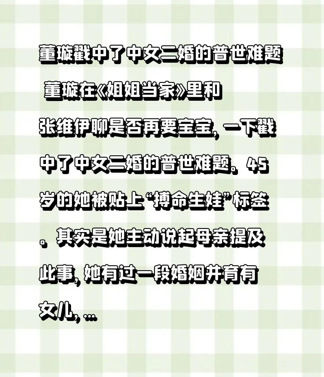 董璇戳中了中女二婚的普世难题董璇在《姐姐当家》里跟张维伊谈及是否再要宝宝的时候
