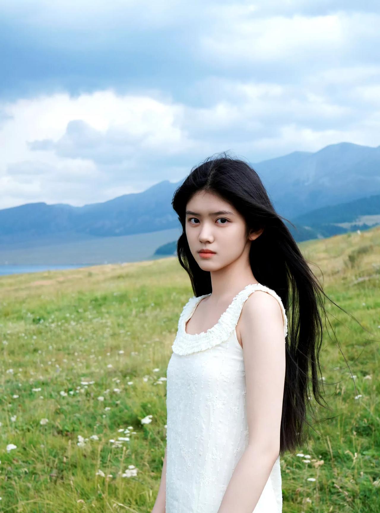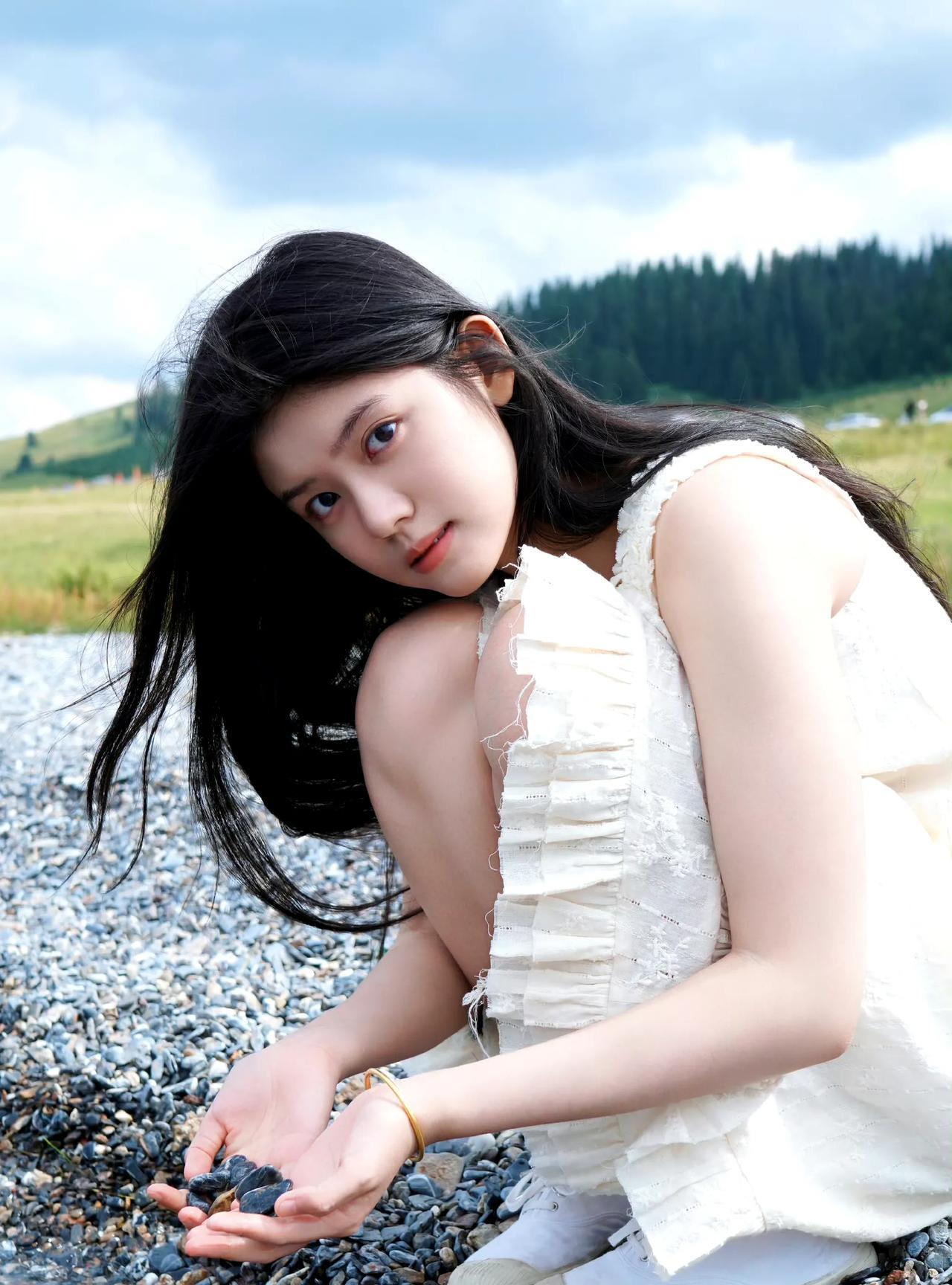 白裙裁着夏风的形状,长发漫过肩头时,湖水也泛起温柔涟漪。弯腰拾几粒石子,赤脚探进清透的水,在草野与山影间,每寸舒展都是和自然的絮语。