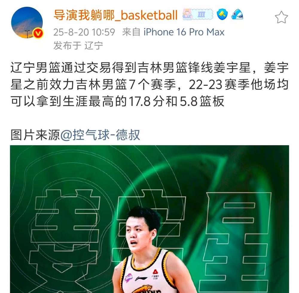 辽篮阵容又升级了!据权威体育媒体报道,吉林男篮的当家球星姜宇星即将和辽篮签约!辽