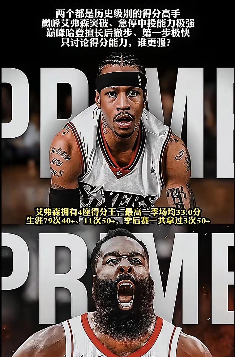 哈登下限高,艾弗森上限高,简单一点就是哈登常规赛厉害,艾弗森季后赛更强硬。在艾弗森的时代,哈登不可能得这么多分,在哈登的时代,艾弗森可以得更多分。