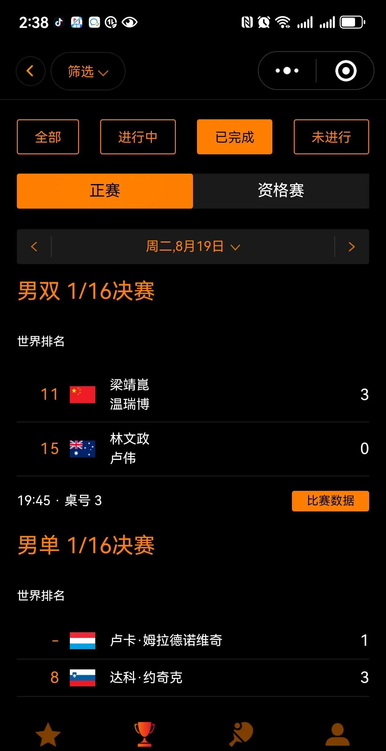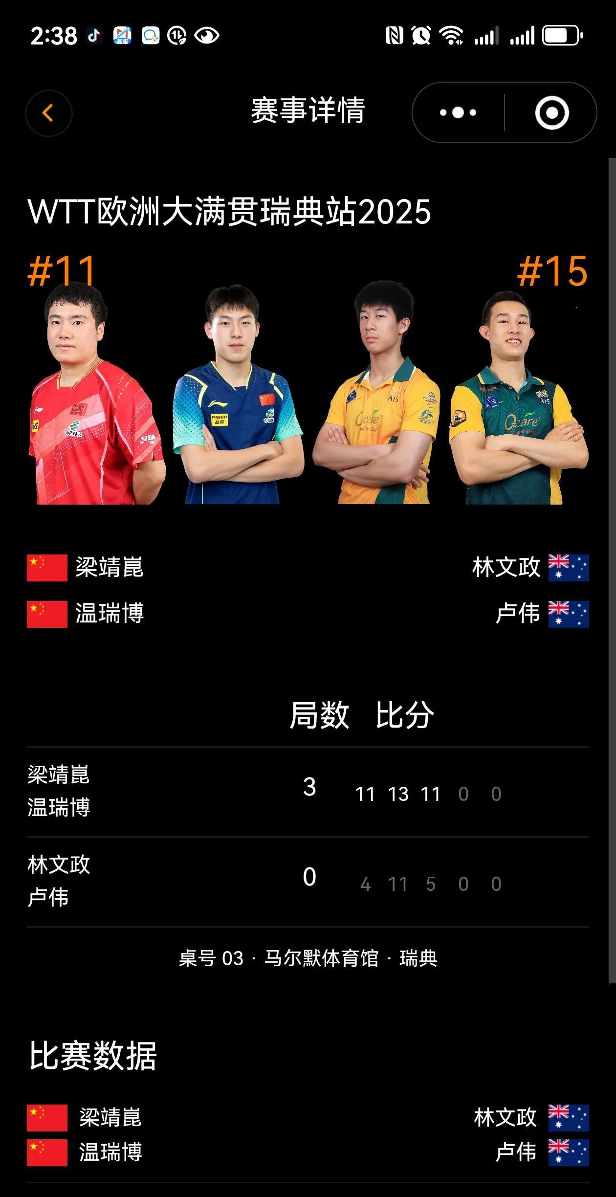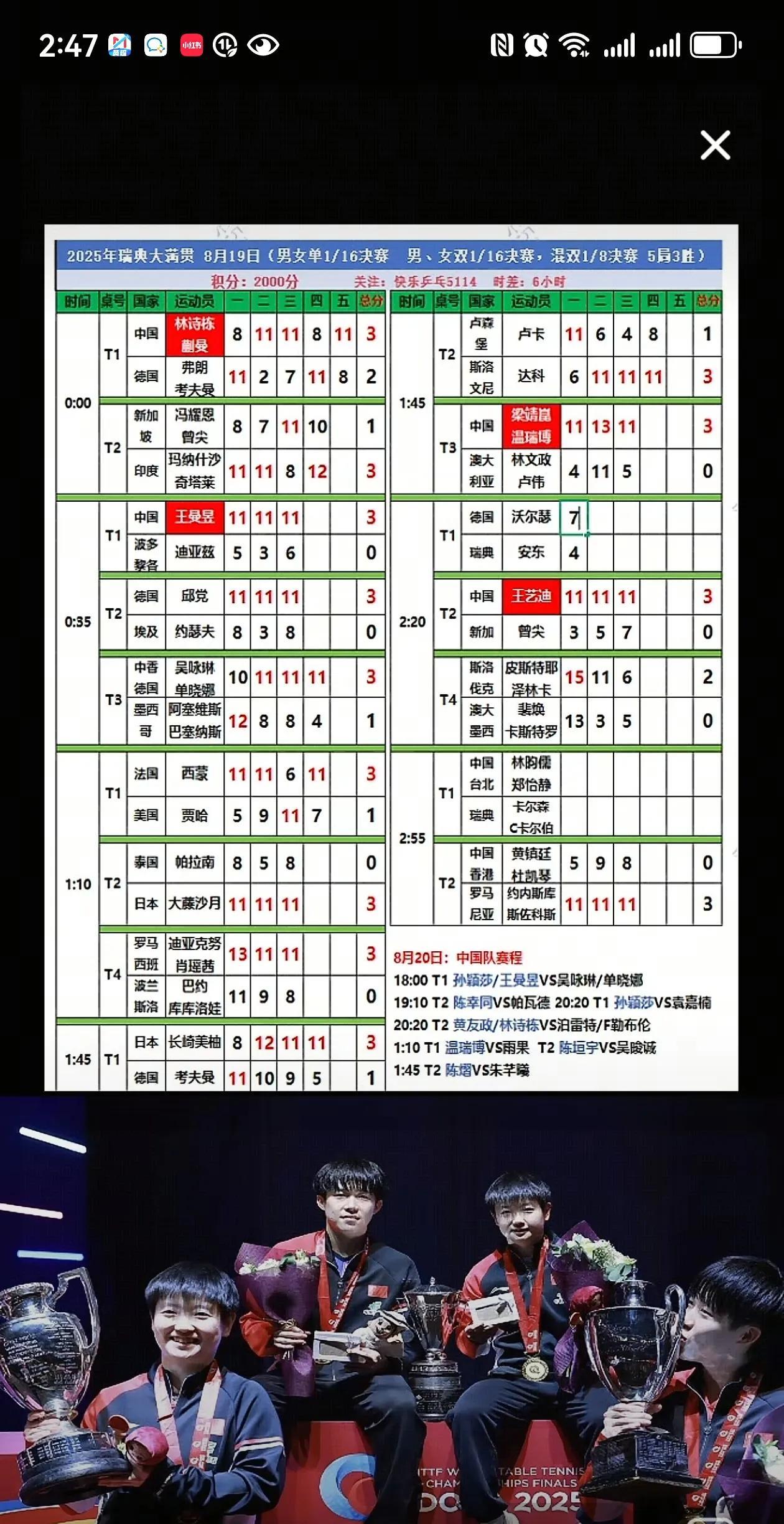 WTT欧洲大满贯瑞典站(8.14-24)当地19日晚场,王曼昱3:0迪亚兹,王艺迪3:0曾尖,梁靖崑/温瑞博3:0林文政/卢伟,晋级16强。林诗栋/蒯曼3:2小弗/考夫曼,晋级八强。 #瑞典wtt#