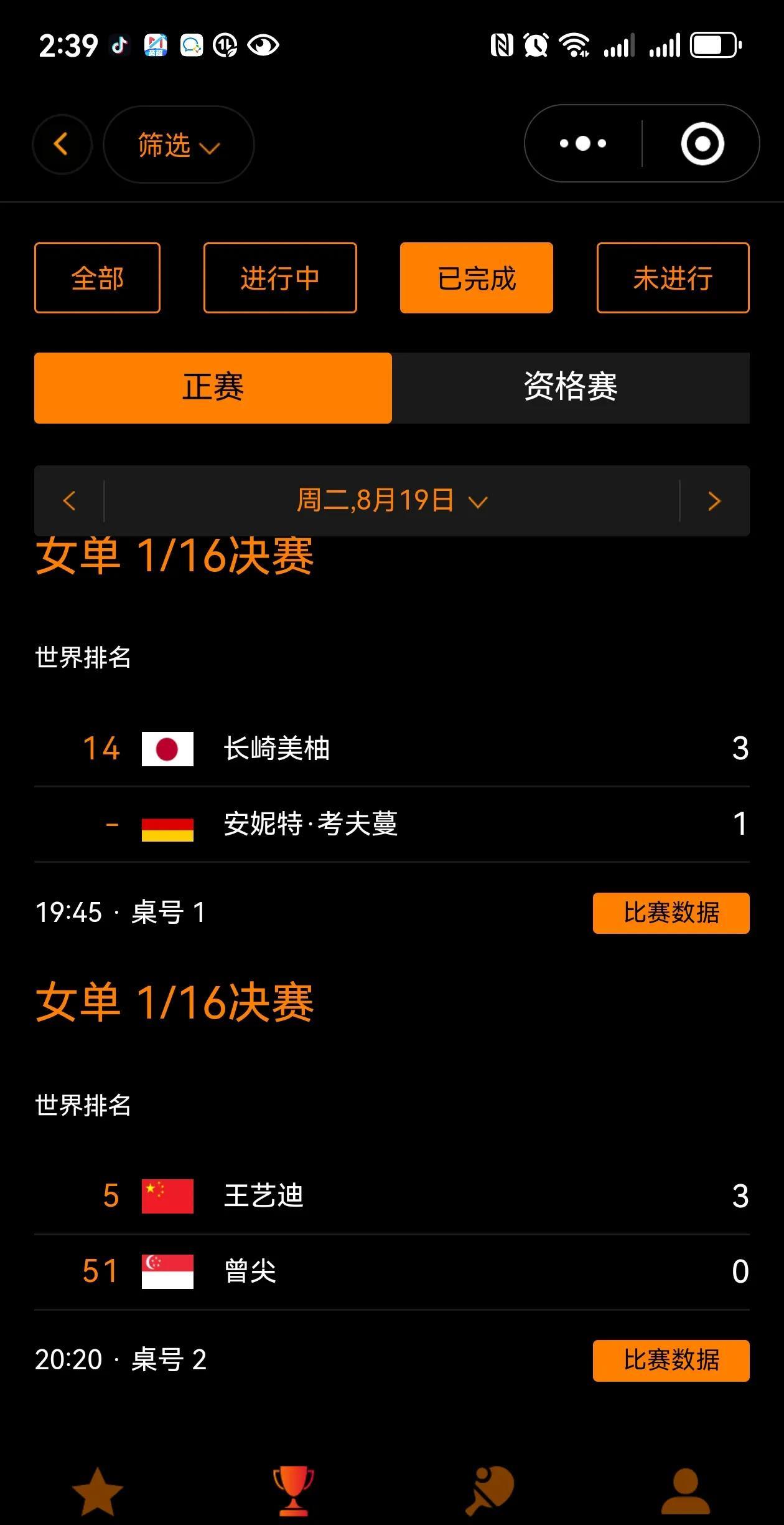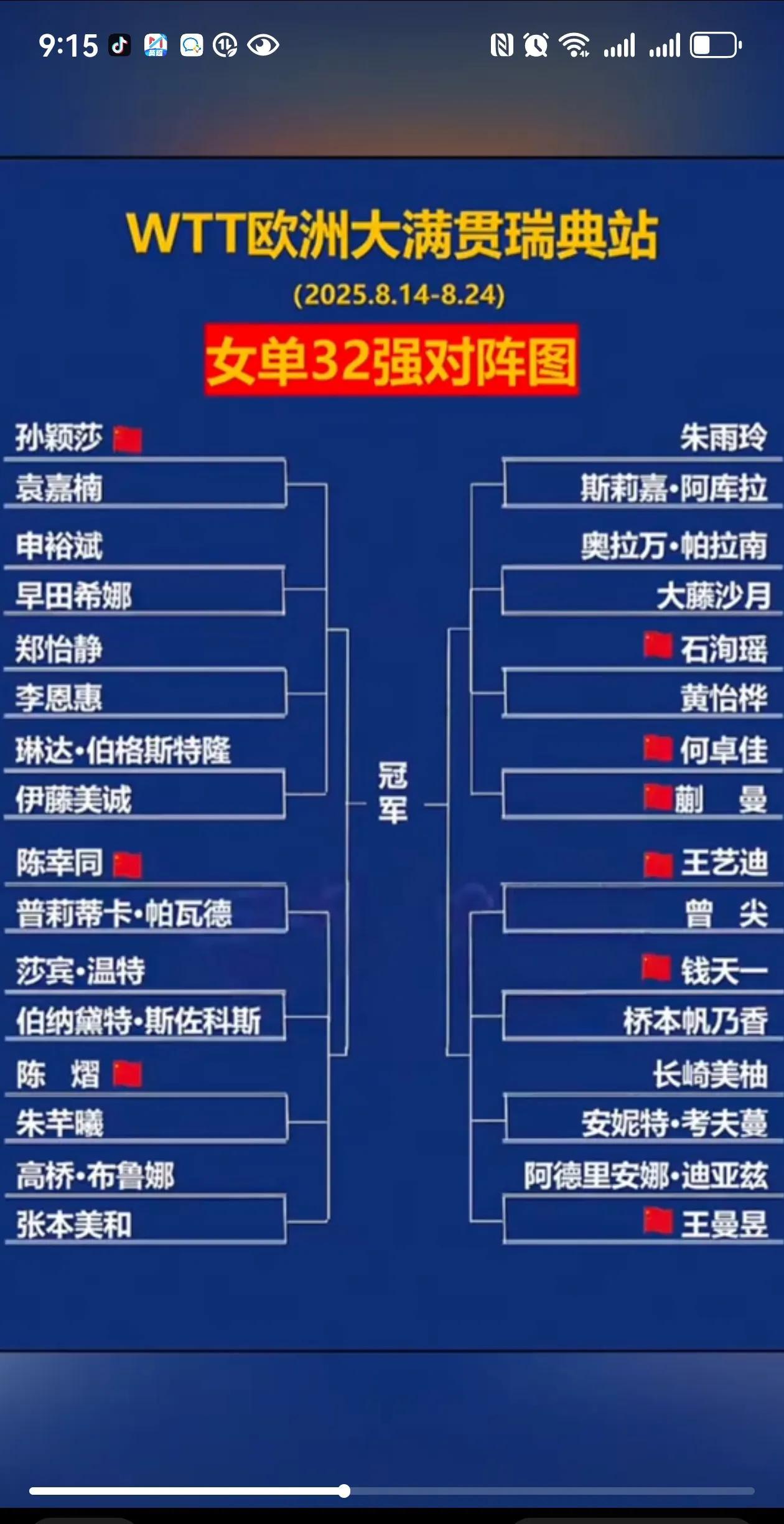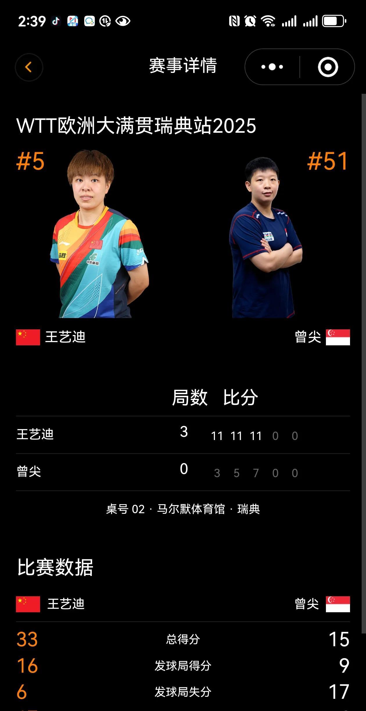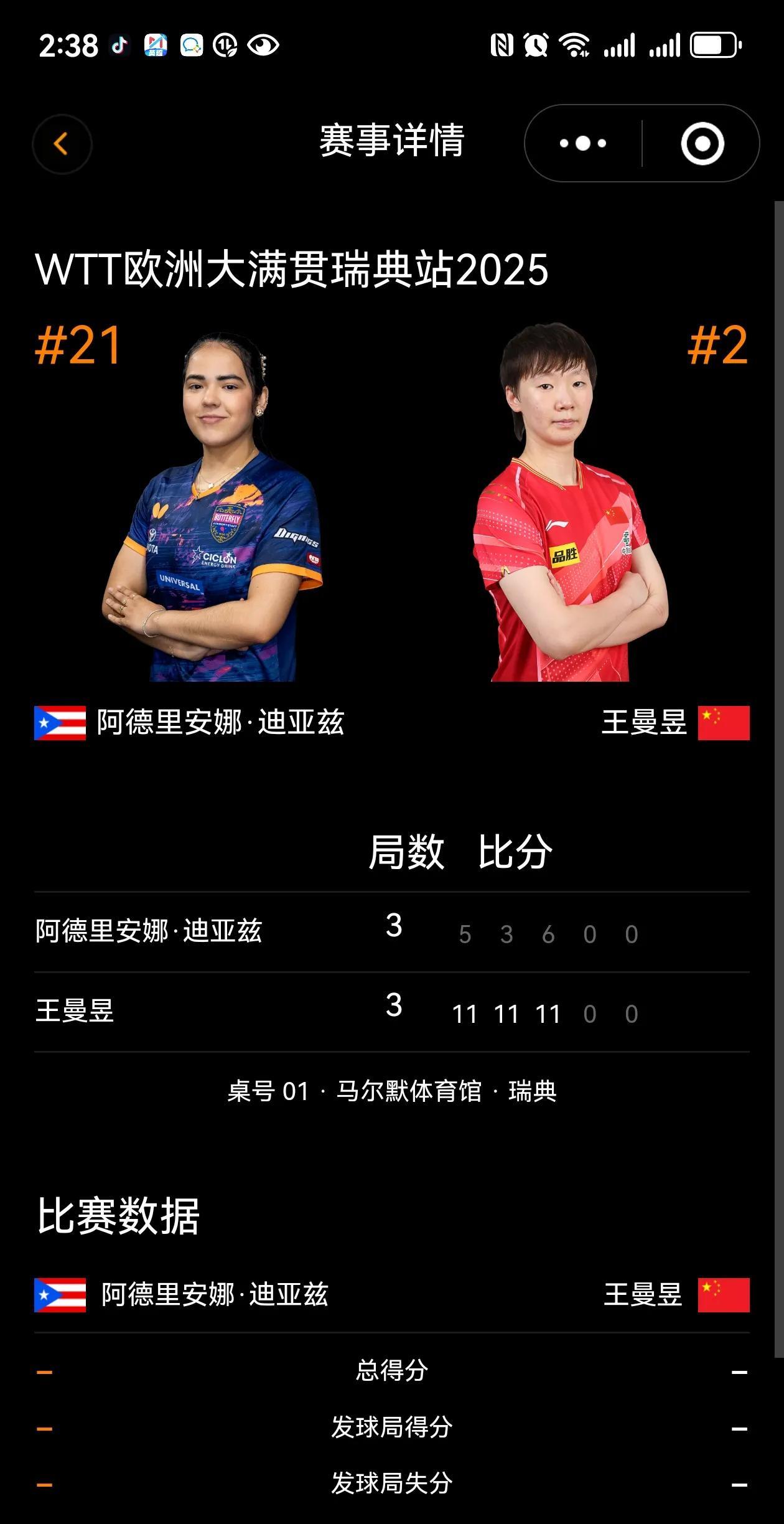 WTT欧洲大满贯瑞典站(8.14-24)当地19日晚场,王曼昱3:0迪亚兹,王艺