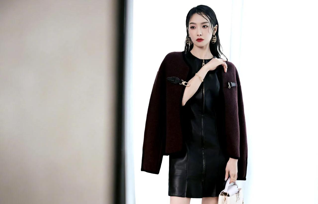 黑裙裁出利落弧光,金属絮语在耳畔流转。酒红外套轻覆肩头,又添几分飒爽余韵;白袋坠