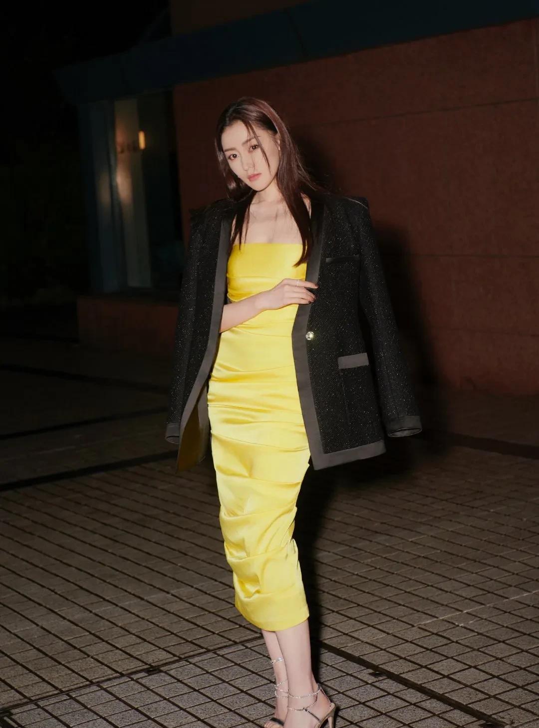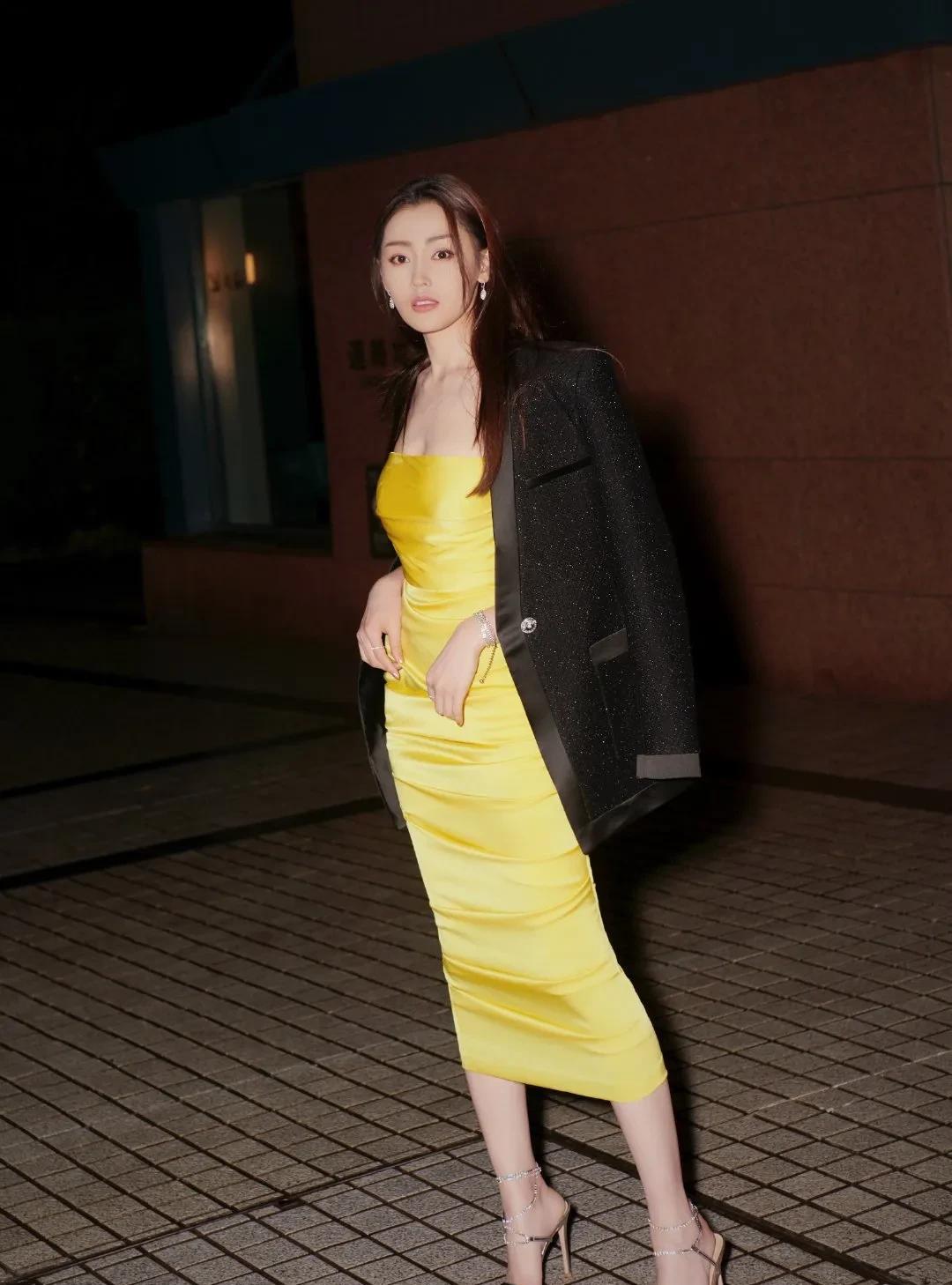 张天爱穿亮黄抹胸裙,肤白到发光,浅笑摇曳生姿,曲线能把马路烫出火,走路都带“姐超slay”气场!