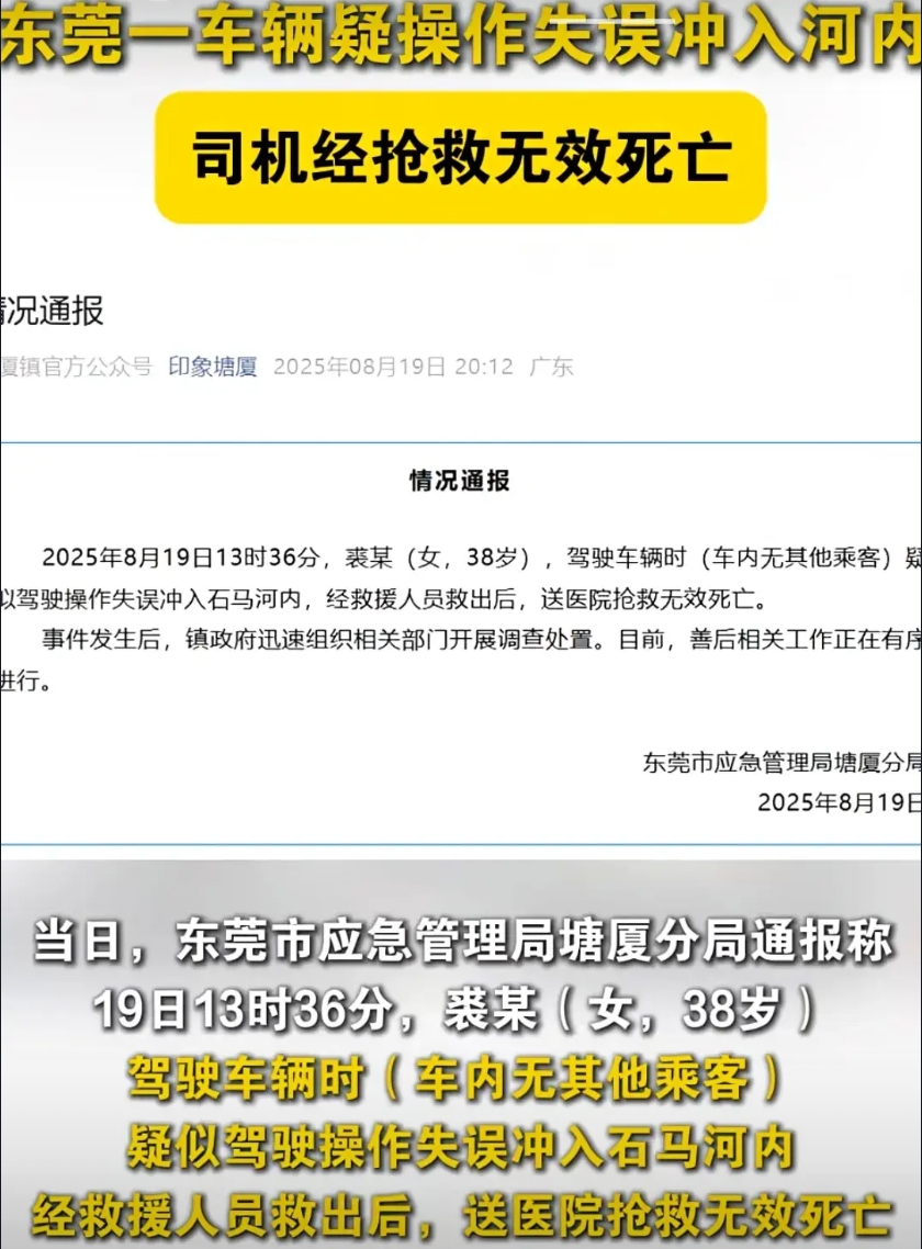 这是8月19日13时36分发生在东莞市塘厦镇石潭埔桥的一起车辆坠河事件,事故中遇难的裘女士年仅38岁。