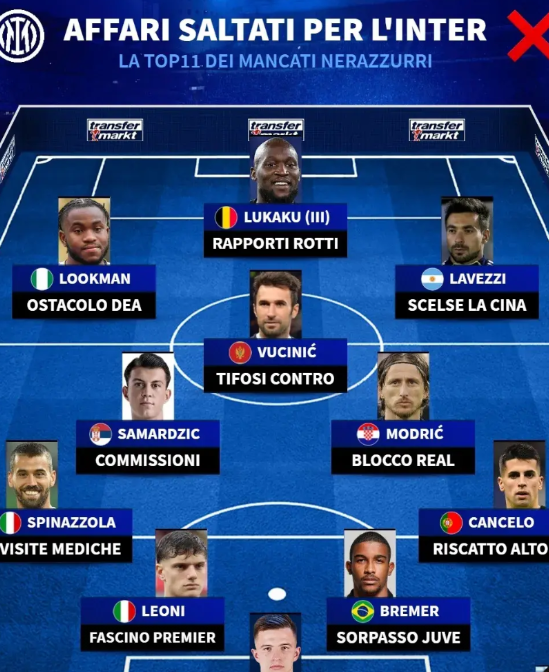 国际米兰这些年错过的球员,德转列举了蓝黑军团错过的最佳11人阵容以及失败的原因。卢卡库(第3次加盟)因为关系破裂,卢克曼因为亚特兰大阻碍,拉维奇选择中超。武齐尼奇因为国际米兰球迷反对。萨马尔季奇因为佣金纠纷。莫德里奇因为皇马阻挠,斯皮纳佐拉体检问题,莱奥尼因为英超高价诱惑,布雷默因为尤文截胡,特鲁宾超出预算, 坎塞洛因为回购价过高。