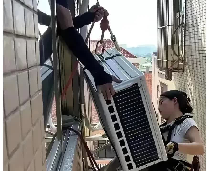 河南新郑有一男子购置新空调后,一对年轻夫妻上门安装。 20多岁的妻子起初被误以为仅负责辅助,实际却全程参与高空作业。 一进来就绑好安全带,翻过窗户去到室外,打孔装机,一点都不拖拉,动作很娴熟,比很多老师傅都利索!胆量也过人, 挂在空中,没有一点紧张感觉,全程都是专注手里的活,不得不佩服! 谁说女子不如男,好样的,给这位女子点赞[赞] 现在干这活夫妻档的不少,这两口子能吃苦耐劳,旺季装空调两夫妻赚四五万没问题。七年干下来,俩人攒下了两套房子,比一般上班族强多了! 夫妻同心,再累的活儿也有奔头。这对年轻人用双手挣生活的样子,比任何精致包装都动人,踏实又有力量! 你们觉得这样的年轻人值得称赞吗? 麻烦看官老爷们右上角点击一下“关注”,既方便您进行讨论和分享,又能给您带来不一样的参与感,感谢您的支持!