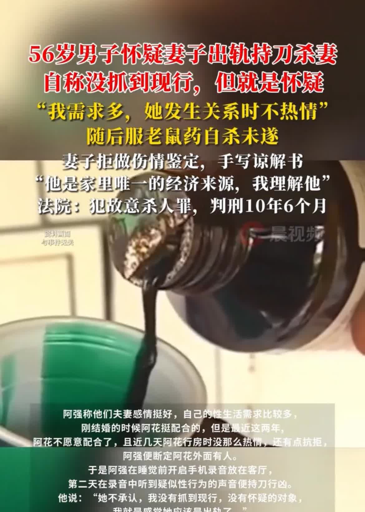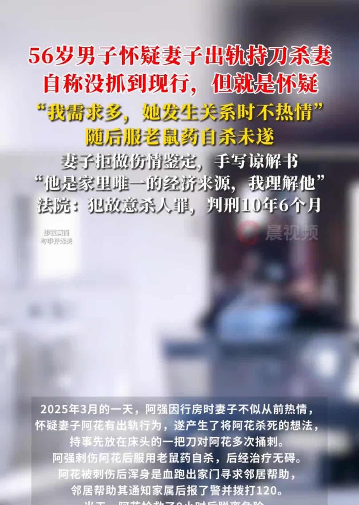 床上不热情,就一定是出轨了吗? 真是服了有些男的,真是为老不尊, 56 岁的男子称跟妻子刚结婚时感情很好,他生理需求比较多,妻子刚开始挺配合,最近两年,不仅没那么热情,还会抗拒,他怀疑妻子外面有人了,就对妻子起了杀念。 男子称,没抓到现行,但就是怀疑,于是放了一把刀在床头,趁妻子睡觉毫无防备的时候,拿刀狠狠刺向妻子,妻子浑身是血的跑了出去,还好被邻居及时送到医院,才保住了一命。 妻子拒绝做伤情鉴定,并且还手写了一份谅解书,说:“男人是家里唯一的经济来源,我理解他,”男子随后服老鼠药自杀未遂,法院还是以故意伤害罪判男子 10 年 6 个月,你觉得该男子是否该判刑呢?对此你怎么看呢?