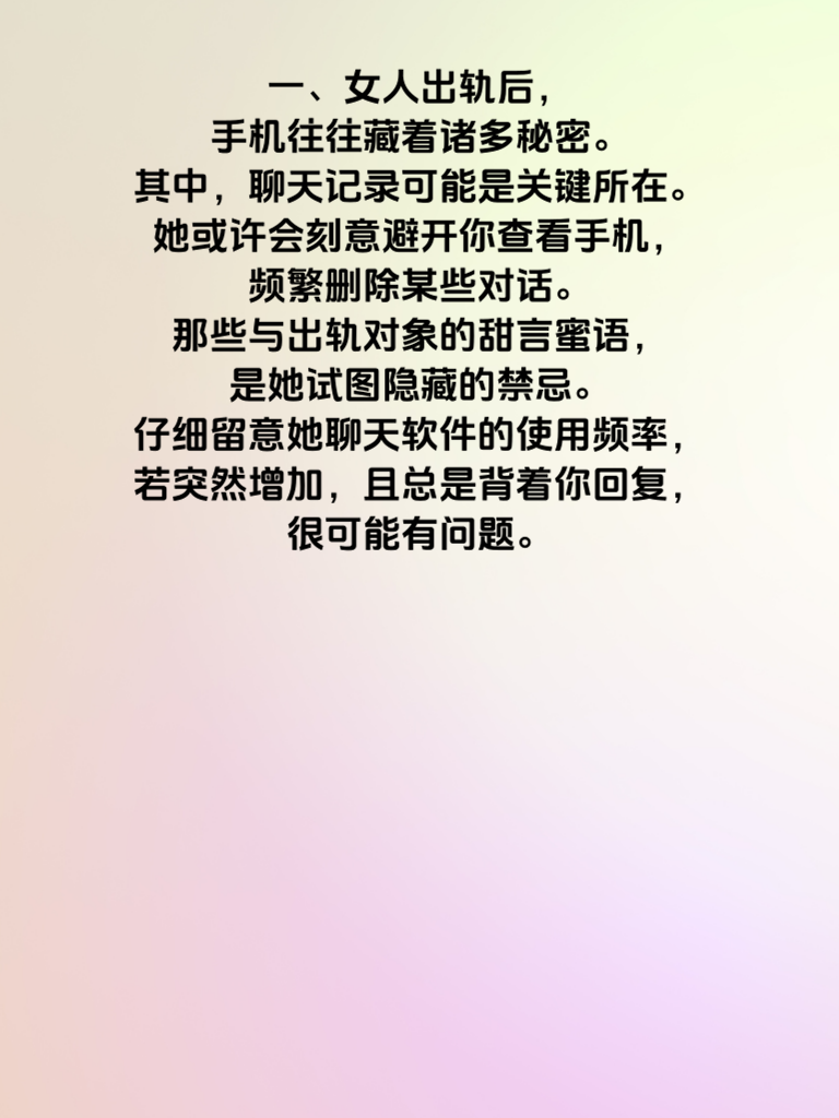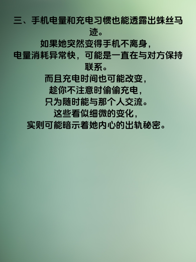 一、女人出轨后,手机往往藏着诸多秘密。其中,聊天记录可能是关键所在。她或许会刻意避开你查看手机,频繁删除某些对话。那些与出轨对象的甜言蜜语,是她试图隐藏的禁忌。仔细留意她聊天软件的使用频率,若突然增加,且总是背着你回复,很可能有问题。 二、相册也是不容忽视的地方。她可能会偷偷删除与出轨对象的合照,或者将重要照片转移到隐秘的文件夹。甚至,她会对手机里的照片格外敏感,稍有风吹草动就紧张不已。原本随意的相册管理,变得小心翼翼,这背后或许藏着不可告人的秘密。 三、手机电量和充电习惯也能透露出蛛丝马迹。如果她突然变得手机不离身,电量消耗异常快,可能是一直在与对方保持联系。而且充电时间也可能改变,趁你不注意时偷偷充电,只为随时能与那个人交流。这些看似细微的变化,实则可能暗示着她内心的出轨秘密。