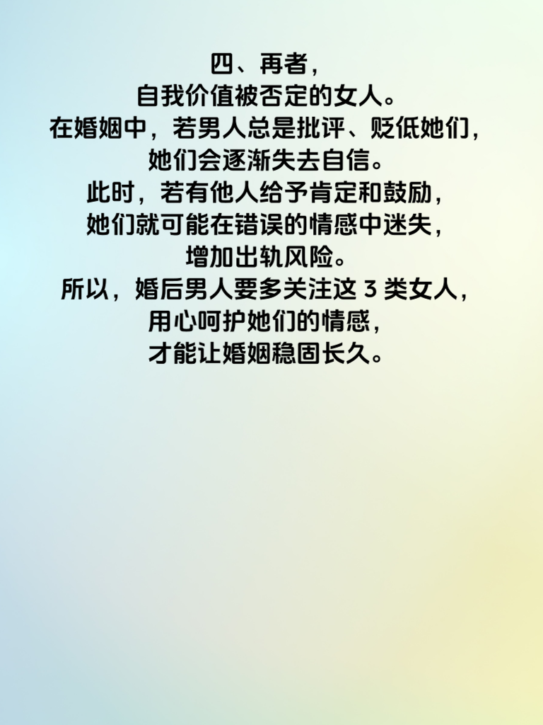 一、婚后生活,犹如一场漫长的旅程,需要夫妻双方共同用心经营。然而,有些男人却在不经意间忽视了身边的女人,尤其是这3类女人,她们的出轨风险正悄然升高。 二、首先,是那些为家庭默默付出一切的女人。她们整日围着家务、孩子和丈夫转,失去了自我。男人若不给予她们应有的关注和感激,她们会觉得自己的付出被无视,内心容易产生失落和孤独感。一旦遇到能理解、欣赏她们的人,就可能陷入情感漩涡。 三、其次,长期被冷落的情感需求型女人。她们渴望丈夫的陪伴、关心和爱意,可丈夫总是忙于工作或应酬,对她们的情感需求置若罔闻。这种长期的冷落会让她们心灰意冷,当外界出现温暖的怀抱时,很容易动摇。 四、再者,自我价值被否定的女人。在婚姻中,若男人总是批评、贬低她们,她们会逐渐失去自信。此时,若有他人给予肯定和鼓励,她们就可能在错误的情感中迷失,增加出轨风险。所以,婚后男人要多关注这3类女人,用心呵护她们的情感,才能让婚姻稳固长久。