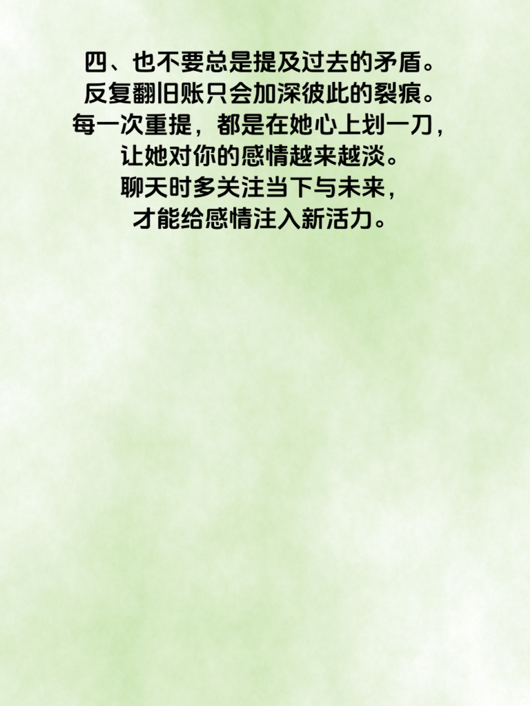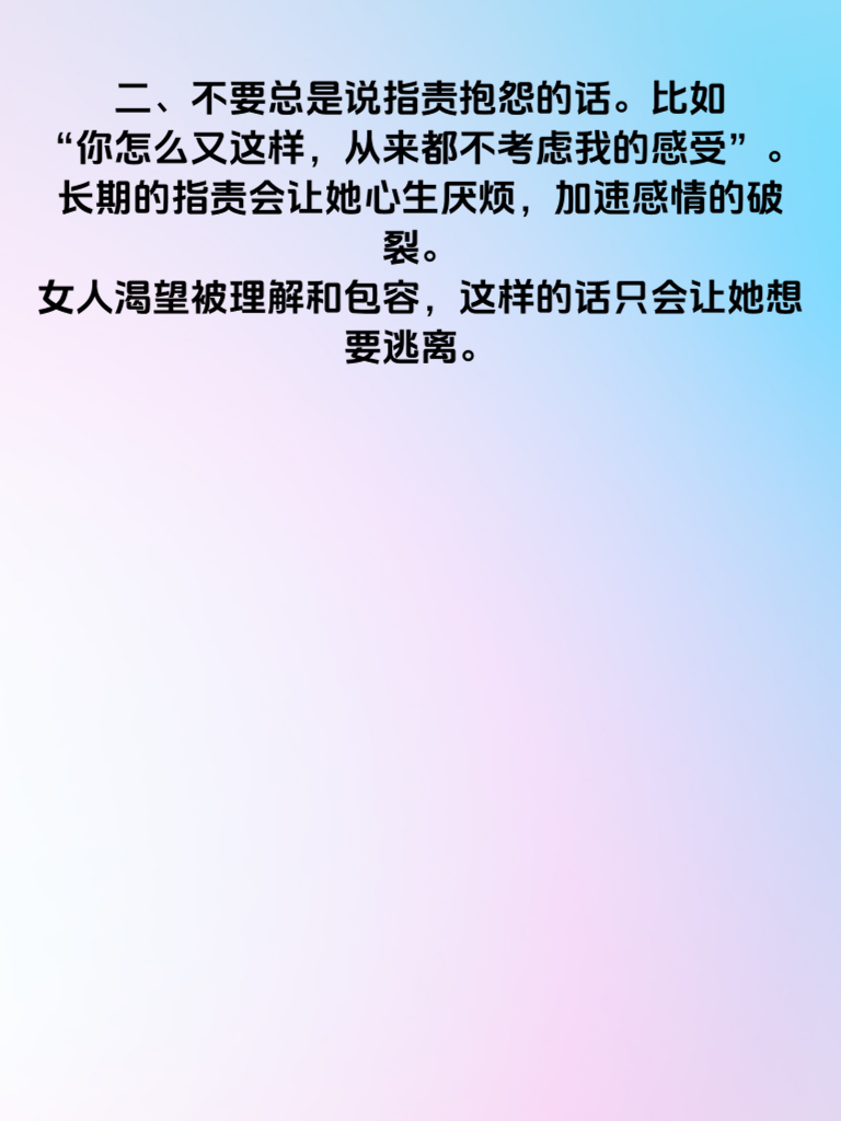 一、女人的心思细腻且敏感,在感情里,她们对男人的言语尤为在意。当女人开始变心,聊天中的一些话就像危险信号,需格外留意。 二、不要总是说指责抱怨的话。比如“你怎么又这样,从来都不考虑我的感受”。长期的指责会让她心生厌烦,加速感情的破裂。女人渴望被理解和包容,这样的话只会让她想要逃离。 三、避免说敷衍冷漠的话。像“嗯”“哦”“随便”这类回应,会让她觉得你对她毫不在乎。她分享的喜怒哀乐,你若如此应付,她会觉得感情变得冰冷。 四、也不要总是提及过去的矛盾。反复翻旧账只会加深彼此的裂痕。每一次重提,都是在她心上划一刀,让她对你的感情越来越淡。聊天时多关注当下与未来,才能给感情注入新活力。 五、若想留住她的心,聊天时就要避开这些雷区。用温暖、理解与爱意去交流,才能让感情长久保鲜。
