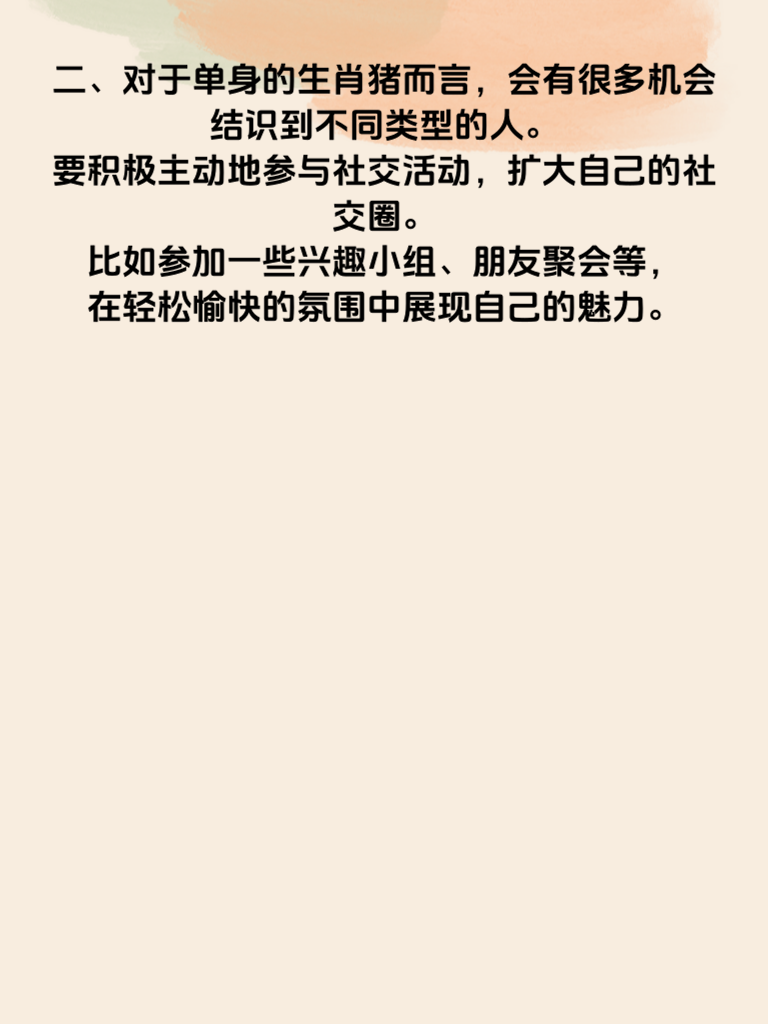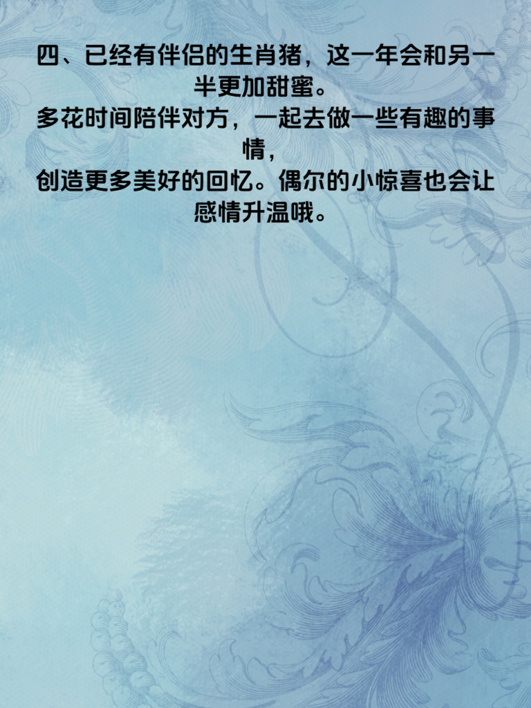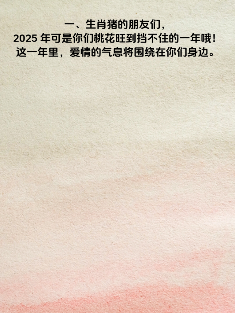 一、生肖猪的朋友们,2025年可是你们桃花旺到挡不住的一年哦!这一年里,爱情的气息将围绕在你们身边。 二、对于单身的生肖猪而言,会有很多机会结识到不同类型的人。要积极主动地参与社交活动,扩大自己的社交圈。比如参加一些兴趣小组、朋友聚会等,在轻松愉快的氛围中展现自己的魅力。 三、在与人相处时,保持真诚和友善是关键。用你的真心去对待每一个人,不要急于求成。也许在某个不经意的瞬间,那个特别的人就会出现在你面前。 四、已经有伴侣的生肖猪,这一年会和另一半更加甜蜜。多花时间陪伴对方,一起去做一些有趣的事情,创造更多美好的回忆。偶尔的小惊喜也会让感情升温哦。 五、总之,2025年生肖猪的桃花运势极佳,只要把握好机会,用心去经营感情,相信爱情会给你们带来满满的幸福。