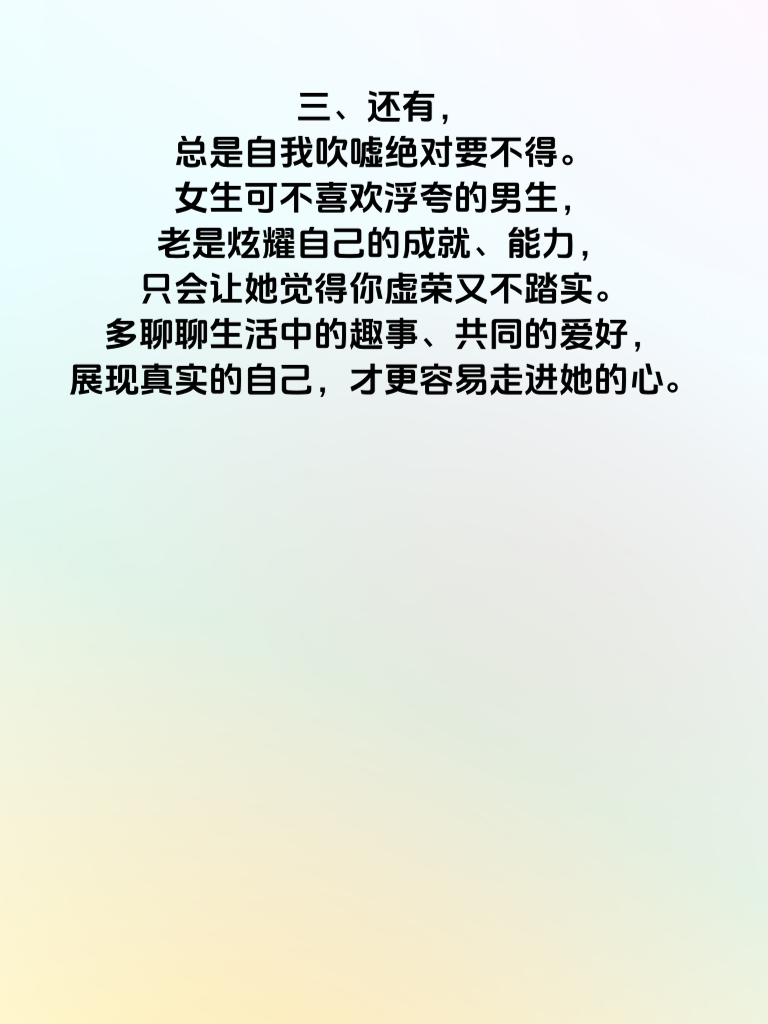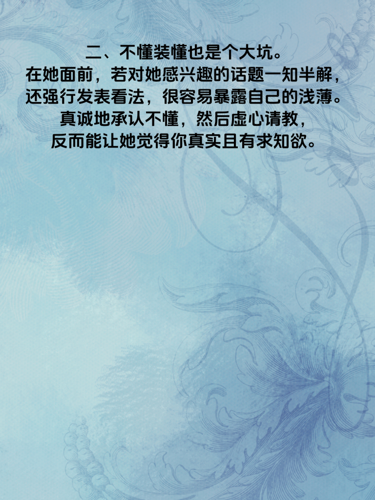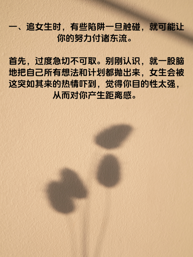 一、追女生时,有些陷阱一旦触碰,就可能让你的努力付诸东流。首先,过度急切不可取。别刚认识就一股脑地把自己所有想法和计划都抛出来,女生会被这突如其来的热情吓到,觉得你目的性太强,从而对你产生距离感。 二、不懂装懂也是个大坑。在她面前,若对她感兴趣的话题一知半解还强行发表看法,很容易暴露自己的浅薄。真诚地承认不懂,然后虚心请教,反而能让她觉得你真实且有求知欲。 三、还有,总是自我吹嘘绝对要不得。女生可不喜欢浮夸的男生,老是炫耀自己的成就、能力,只会让她觉得你虚荣又不踏实。多聊聊生活中的趣事、共同的爱好,展现真实的自己,才更容易走进她的心。 四、另外,忽略她的感受是大忌。她分享心情时,若你心不在焉,或者她需要陪伴时你总找借口,这会让她觉得你不在乎她。用心去感受她的喜怒哀乐,适时给予关心和支持,才能赢得她的好感。