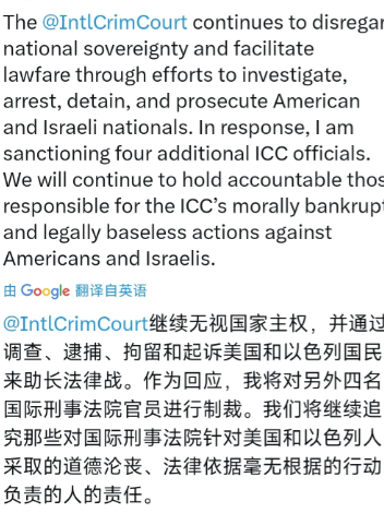 评几句:美国从未加入国际刑事法院,却曾经妄图利用它来审判他人;美国没有参与联合国海洋公约,却肆意依据此要求别国;美国公然无视联合国宪章,随意对主权国家发动侵略却不受惩处;美国连续多年违反联合国决议,肆无忌惮地对别国发动制裁、逮捕别国公民。这哪是什么基于规则的国际秩序,分明就是“顺我者昌,逆我者亡”的霸道美国。而这一次,美国是因为以色列总理内塔尼亚胡去年被国际刑事法院发出逮捕令,近期美国与国际刑事法院又产生新的纷争,对国际刑事法院实施了新的制裁。