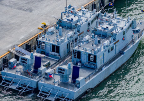 菲律宾海军展出两艘新服役的以色列造 Shaldag MK V导弹艇PG-908和PG-909。配备一门30毫米主炮、两套遥控武器站和一部“长钉”NLOS导弹发射装置(配备3模导引头,具备对海对地精确打击能力,最大射程约25公里)。 Shaldag MK V导弹艇采用全铝制造,长32.6米,宽6.2米,排水量约95吨,最大航速可达40节,航程超过1000海里。 菲律宾共订购9艘该款导弹艇,总价值约2.09 亿美元。