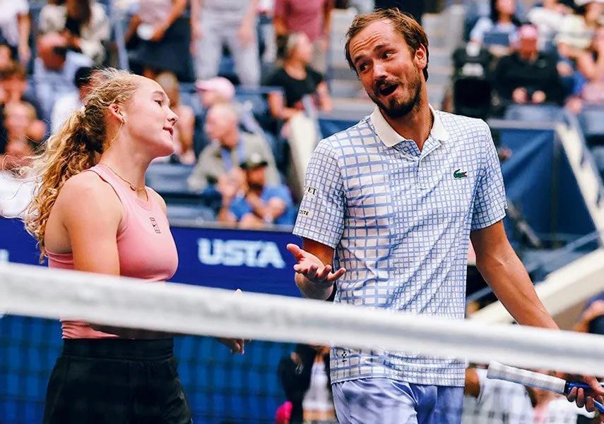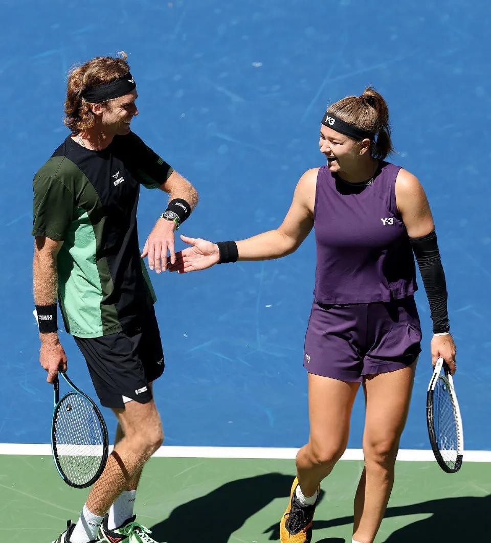 真是男女搭配干活不累,美网混双比赛真是太欢乐了。 阿卡搭档拉杜卡努,化身“显眼包”,一边打球,一边逗乐耍宝,笑得见牙不见眼。 梅总在青春美少女“小米拉”的影响下,像年轻了十岁,活泼了很多。 斯瓦泰克一改往日的严肃,和鲁德有说有笑。 冰美人莱巴金娜和弗里茨搭档,也露出了难得的笑容。 本西奇依偎在发小兹维列夫的怀里,像一个害羞的小女孩,不知道还以为两人是真cp呢。 你喜欢哪对混双组合呢?