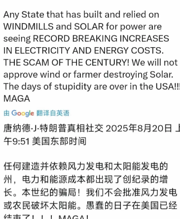 他写道:“任何依赖风力发电机和太阳能发电的州都在经历创纪录的电力和能源成本上涨。这是本世纪最大的骗局!我们不会批准破坏农民土地的风能或太阳能。”
