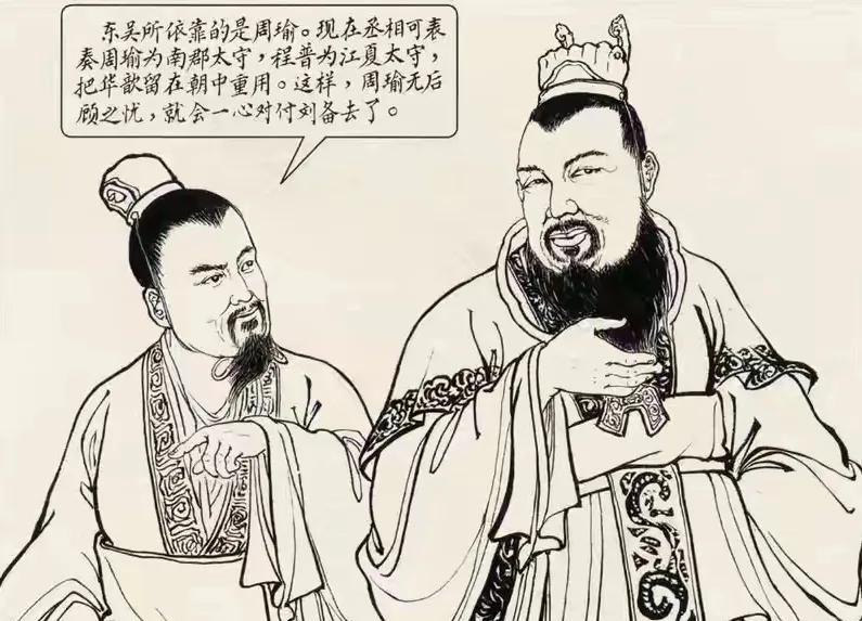 刘备东吴招亲,让江东赔了夫人又折兵。孙权虽然十分气恼,但也听从了顾雍建议,派华歆到许都表奏刘备为荆州牧,再伺机夺取荆州。 曹操本来建成铜雀台,正在兴头上,在得知刘备招为东吴乘龙快婿后,勃然大怒。谋士问其故,曹操说:“刘备如困陆之鱼,现得荆州如鱼归大海,今后更难对付。”谋士哈哈大笑,说“孙刘联姻,并非铁板一块,孙权早想杀刘备、夺荆州。丞相只需封赏周瑜,让他安心主公,那么他就可以全力对付刘备了。”曹操大喜,依计而行。 果然,周瑜被封为南郡太守后,全力对付刘备,一心要讨回荆州,最后反被诸葛亮气了三次,绝气身亡。