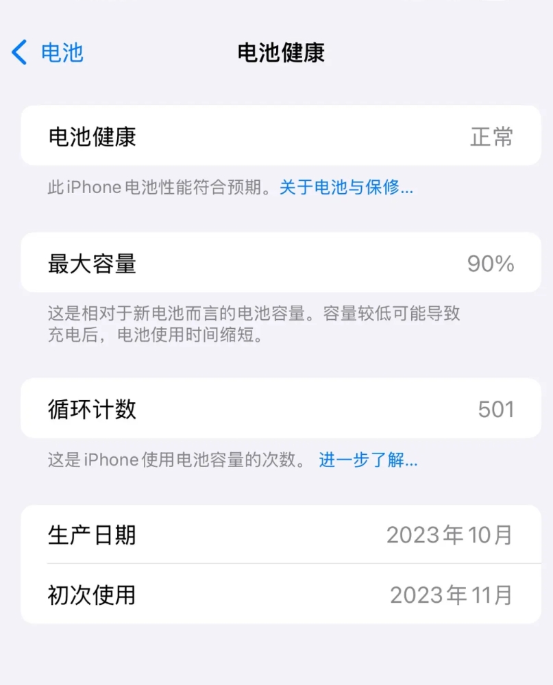 我手里这台iPhone15 Pro Max,使用了将近两年时间,目前电池健康度终于降到90了,循环次数也超过了500次,其实还算充电比较少的了,大多数用户,使用这么久,应该是七八百次了。