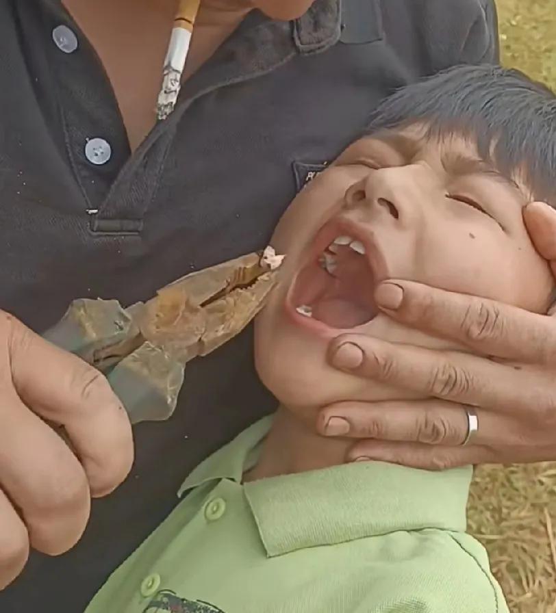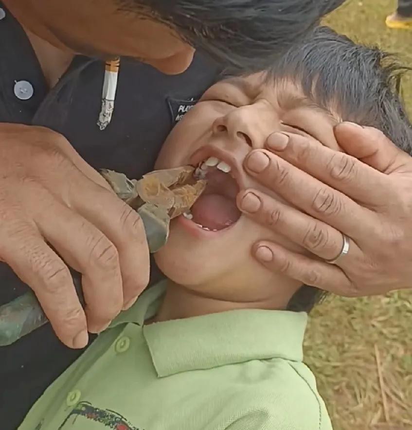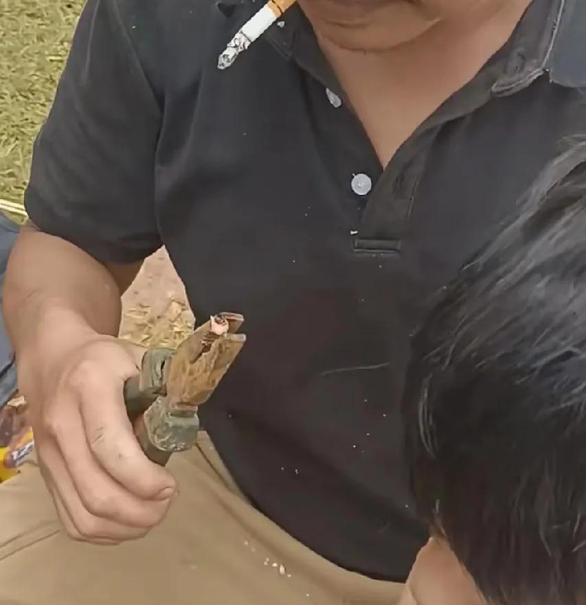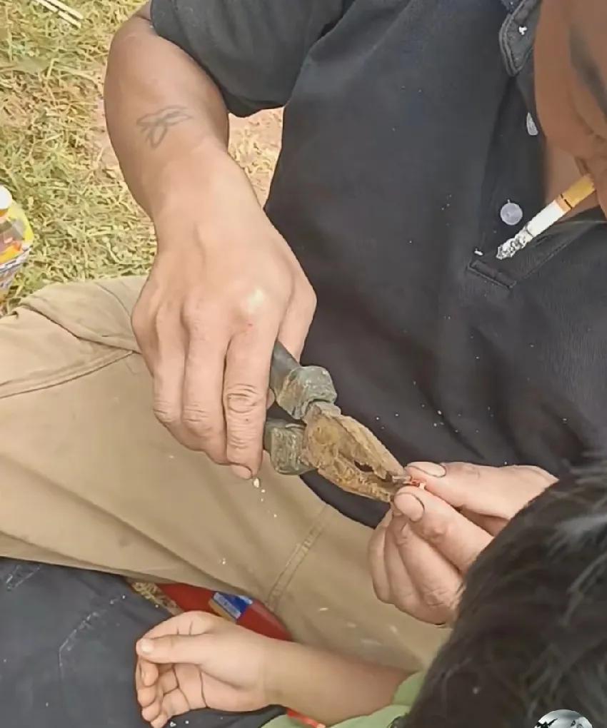 锈钳子,叼烟的爹,乖娃。就不能换把干净的?不怕带菌。锈迹斑斑的钳,烟灰摇摇欲坠——父爱沉沉,却糙得很。咱讲究点卫生好不好?