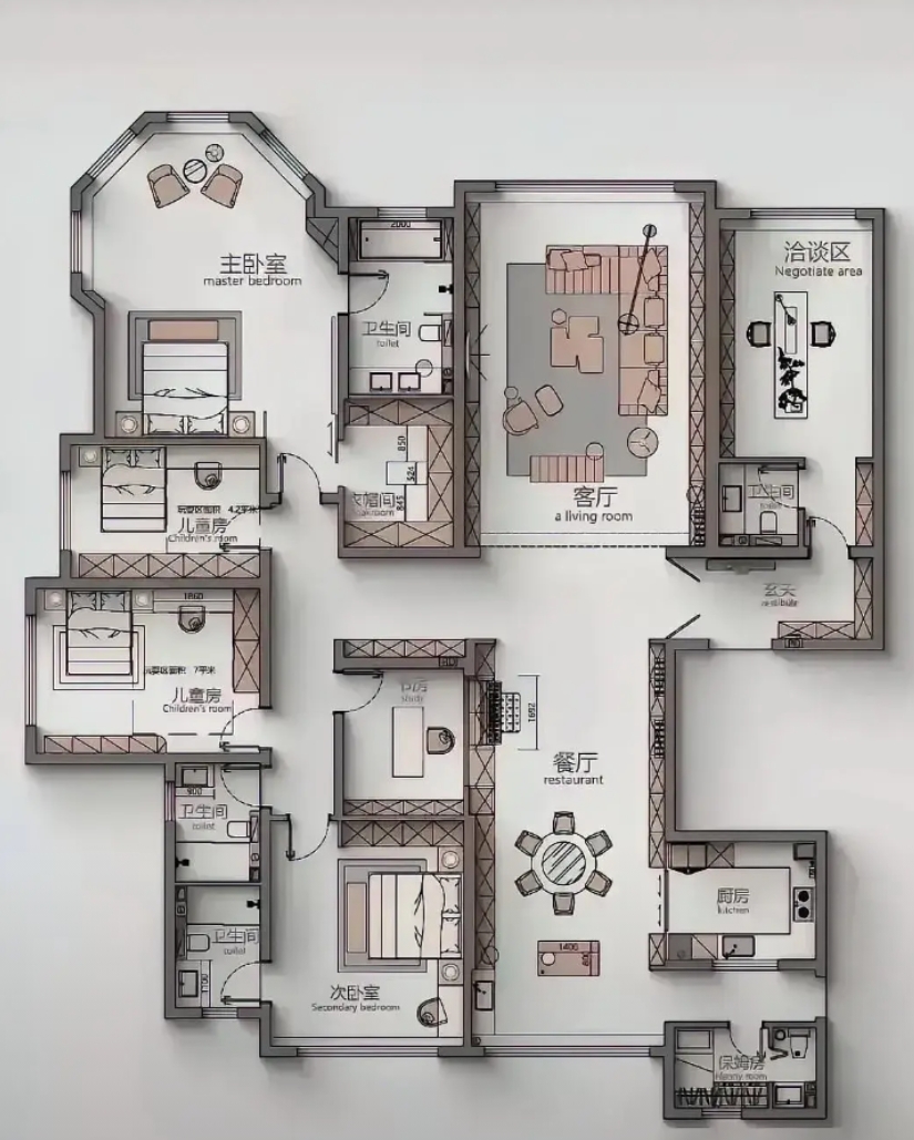 客厅和洽谈间改成主卧室,厕所,儿童房。这边改成客厅和洽谈厅不好吗?