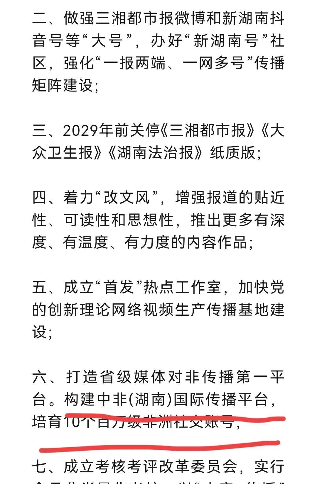 湖南日报报业集团这篇野心……哦不,雄心勃勃的宣言,把人看懵逼了, 且不说那么多规划能不能落实,实不实际, 广州日报也没这么做吧? 咱不是说不能宣传非洲, 但是,你湖南日报是官媒啊,你的各项开支花的是政府预算,是老百姓的赋税钱啊, 你宣传的核心,应该是民生啊,取之于民,用之于民, 拿这个钱,培育出10个百万级对非社交账号,能给湖南带来什么?跟老百姓有啥关系? 湖南很多非洲人吗? 湖南在非洲很多企业吗? 所以,有没有懂行的解释一下,湖南日报这个非洲优先的宣传目标,深层次的内涵和意义,到底是什么?#头号创作者激励计划#