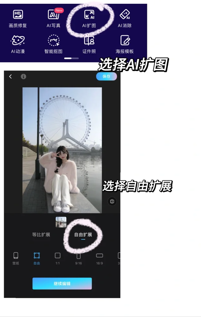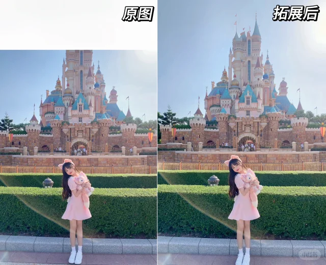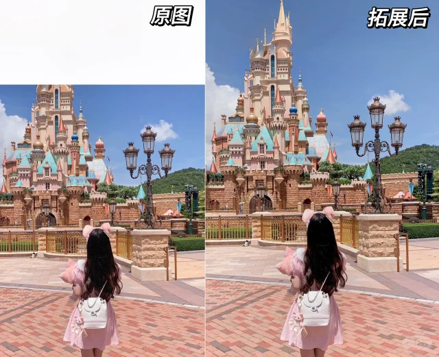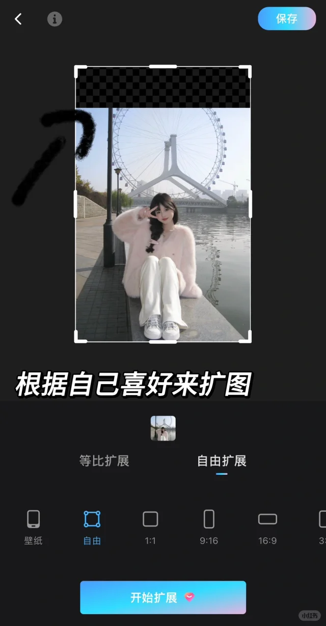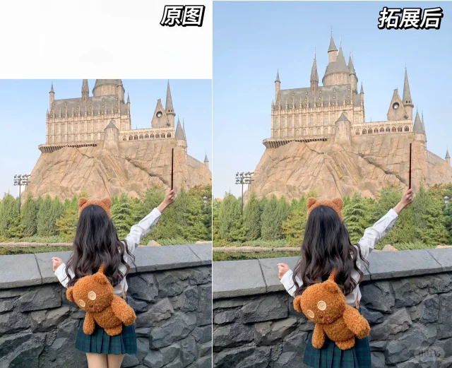 出去旅游玩的时候朋友拍的构图不是很喜欢 没把景拍全 美🐰秀秀这个功能 小图直接变大图 画面一下高级了~ 使用自由扩展按照自己的喜欢扩图 又能扩出景 比例也直接成壁纸了~