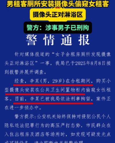 “解释不清了!”西安,小伙去姐姐出租房洗澡,不料,竟然在卫生间抽屉里,发现了一个摄像头,而且正对着淋浴区,这个摄像头可以不联网,不插内存卡,小伙告诉姐姐后,姐姐怀疑不是房东就是室友干的,果断选择了报警!警方:已经立案正在调查! 西安一名小伙,某天去姐姐的出租房,打算在那里洗澡,进入卫生间后,他无意间拉开了卫生间的抽屉,没想到竟然在里面发现了一个摄像头。 仔细观察后发现,这个摄像头的镜头正对着淋浴区,显然是被人刻意放置在那里,目的就是拍摄淋浴时的画面,随即小伙进一步查看摄像头,发现这个不需要连接网络,也不用插入内存卡就能工作。 这一发现让身为弟弟的他,立刻警觉起来,意识到姐姐的隐私可能已经被侵犯,马上把这件事告诉了姐姐,随即在她姐姐得知情况后,又惊又怒,第一时间开始猜测是谁安装了这个摄像头。 但是她思来想去,觉得在出租房里,有机会接触并在卫生间抽屉放摄像头的,不是房东就是合租的室友,因为这两类人平时能自由出入她的出租房,具备安装摄像头的条件。 考虑到这件事已经严重侵犯了自己的隐私权,姐姐没有犹豫,果断选择了报警,希望通过警方的介入查明真相,找出安放摄像头的人,她害怕对方将自己洗澡的画面所记录下来! 警方接到报警后,迅速赶到现场进行处理,对现场情况进行了勘查,也对相关人员进行了初步询问之后,警方明确表示,目前这起案件已经正式立案进行调查! 好在经过警方多日的调查,确认了这个摄像头就是女子合租室友安放的,并且这个室友是位男生,现如今警方已经将其带回进行审问,男子也承认了自己的罪行,已经被依法进行处置! 这件事很快被曝光在了网上,事件一经曝光,在网上迅速地,引起了众多网友的热议: 有的网友称道:“什么要和男士友合租?这样本来就很危险,其他看完了视频,按耐不住狂性大发,那后果就不堪设想!跟异性合租这种事,君子不立危墙之下的道理都不懂” 还有的网友说道:“社会公德被玩坏了,陌生人之间的坦荡和真诚正在被慢慢消融,最后会不会和西方国家一样晚上不敢出门?” 现如今女子因为遭遇了这件事情,已经从出租房内搬出暂时居住在了朋友家,希望她经历过这件事之后,对自己的安全问题有一个新的认知,一定要保护好自己! 那么,对于这件事,大家有什么看法? 信源:都市报道