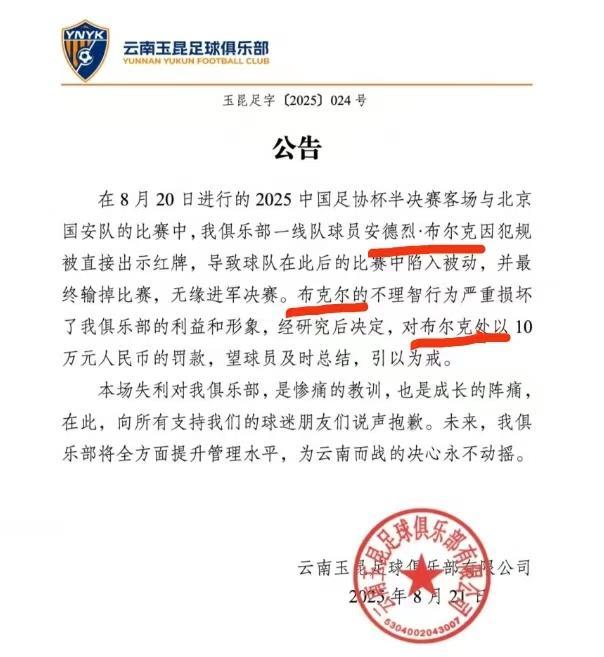 云南玉昆足球俱乐部,严谨一点好不好? 处罚的到底是布尔克还是布克尔? 足协杯半决赛, 云南玉昆0-7惨败北京国安。 赛后,俱乐部把输球的恶气出在外援身上。 第一时间发布公告, 对因恶意犯规吃到红牌的33号球员布尔克罚款10万元。 公告中错把布尔克写成布克尔, 撰文的人也要背锅挨骂了哦。