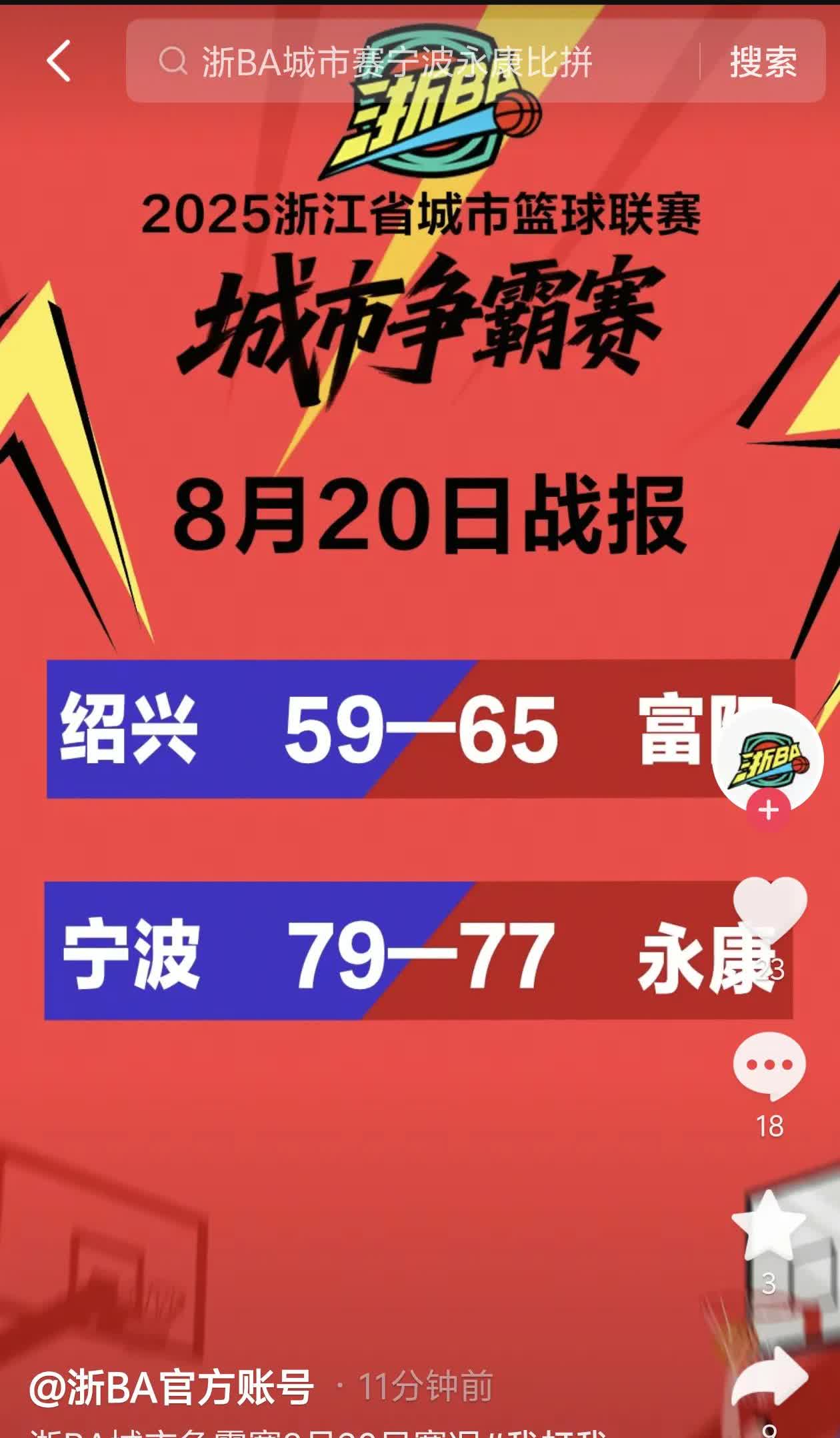 富阳客场胜绍兴联队宁波险胜永康 浙BA第一轮10场比赛已结束 杭州2:0绍兴 温州2:0丽水 湖州2:0台州 嘉兴2:0衢州 宁波1:1金华 宁波金华都是险胜,余姚永康实力可以 富阳、苍南战胜地级市联队,实力强劲