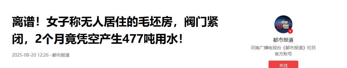 河南新乡,女子买的新房是毛坯状态,没装修、没入住,阀门从未开过。准备装修时得知,竟然凭空产生477吨用水,加上滞纳金,水费高达2837.81元。她怎么都想不明白,这水是哪里来的,又漏到哪里去了。女子:太离谱,阀门都是锁着的。 据都市报道发布于2025年8月20日发布,庞女士(化名)想破头都想不明白,自己2021年交房,一直没有入住,当她今年要入住的时候竟然发现自己有一笔欠款!竟然是水费产生的! 庞女士特别纳闷,自己2019年买下了一套房子,房子是毛坯状态,她想着等手头宽裕些再装修,就一直把房子空着。期间,她几乎没关注过水电情况,毕竟房子没装修,连水龙头都没装,能有啥用水? 自从2021年交完房子之后,这间房就一直空置着,没有人居住过,等到今年,庞女士攒够了钱,高高兴兴的来到自己买的这套房子,联系装修公司准备装修。 可她在装修时,去物业那边办手续,却被物业告知他们有一个欠费需要处理一下,庞女士当时就懵了!然后拿出手机就看到上面显示自己家的水费产生了2837.81元,其中包含滞纳金1025元,相当于产生了477吨的水! 可是她自己心里清楚得很,自从2021年,自己和家人从来没有来过这间房子,怎么可能会用水呢?庞女士第一反应就是不可能,赶紧跑到房子里查看。毛坯房里,水管阀门好好锁着,墙面地面干燥,压根没漏水痕迹。 她找到物业,物业也觉得奇怪,工作人员跟着去现场检查,确认阀门没开,也没发现漏水点,而且水管全都在外面漏着,这就奇了怪了,那自己家这凭空出现的水费是怎么回事? 水费总得有个说法,庞女士又联系水务公司。水务公司回复,若对用水量有疑问,可申请鉴定水表。可协商时,双方却没达成一致,庞女士觉得水务公司给的解决方案没法让她信服。 随后,庞女士找到记者介入进行协商,最后庞女士表示已经协商一致,解决方案她也很满意。对方也承诺三五天就把事情给解决了。 这事虽说解决了,但是也提醒着大家不管是新房还是旧房,定期检查水电表很重要,遇到异常情况,得赶紧找相关部门核实,别等问题闹大。 同时,遇到不合理的事儿,就得像庞女士这样,坚持讨说法,维护自己权益。毕竟,谁的钱都不是大风刮来的,不能稀里糊涂吃亏。 这事传到网上,网友们纷纷评论。有人说:“这也太离谱了,毛坯房又没人住,平白无故产生这么多水费,肯定是哪里出问题了!会不会是水表故障?或者是之前管道里的水没算清楚?” 也有网友分享类似经历:“我朋友家也遇到过,最后查出来是水表计量出问题,折腾了好久才解决。” 大家议论纷纷,都在关注这事到底咋收场。 对此你怎么看?欢迎大家在评论区留言讨论。